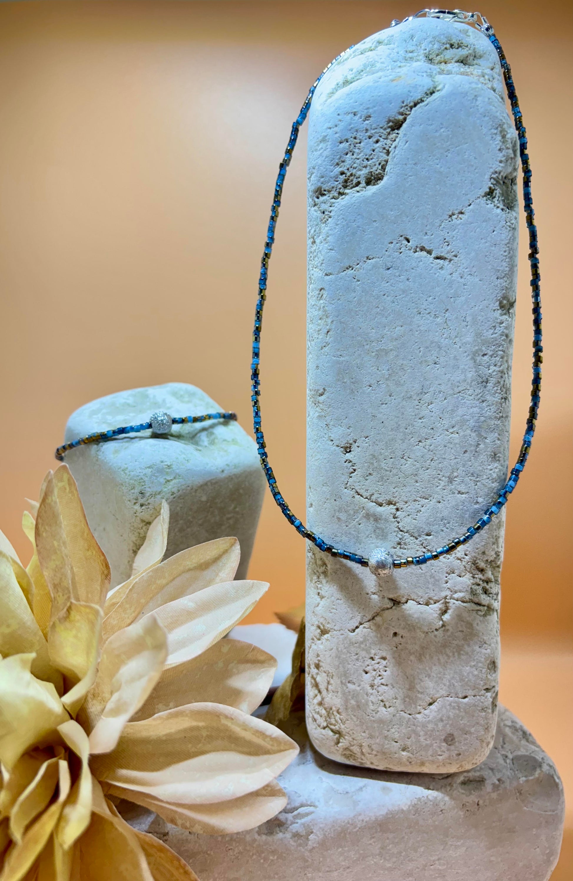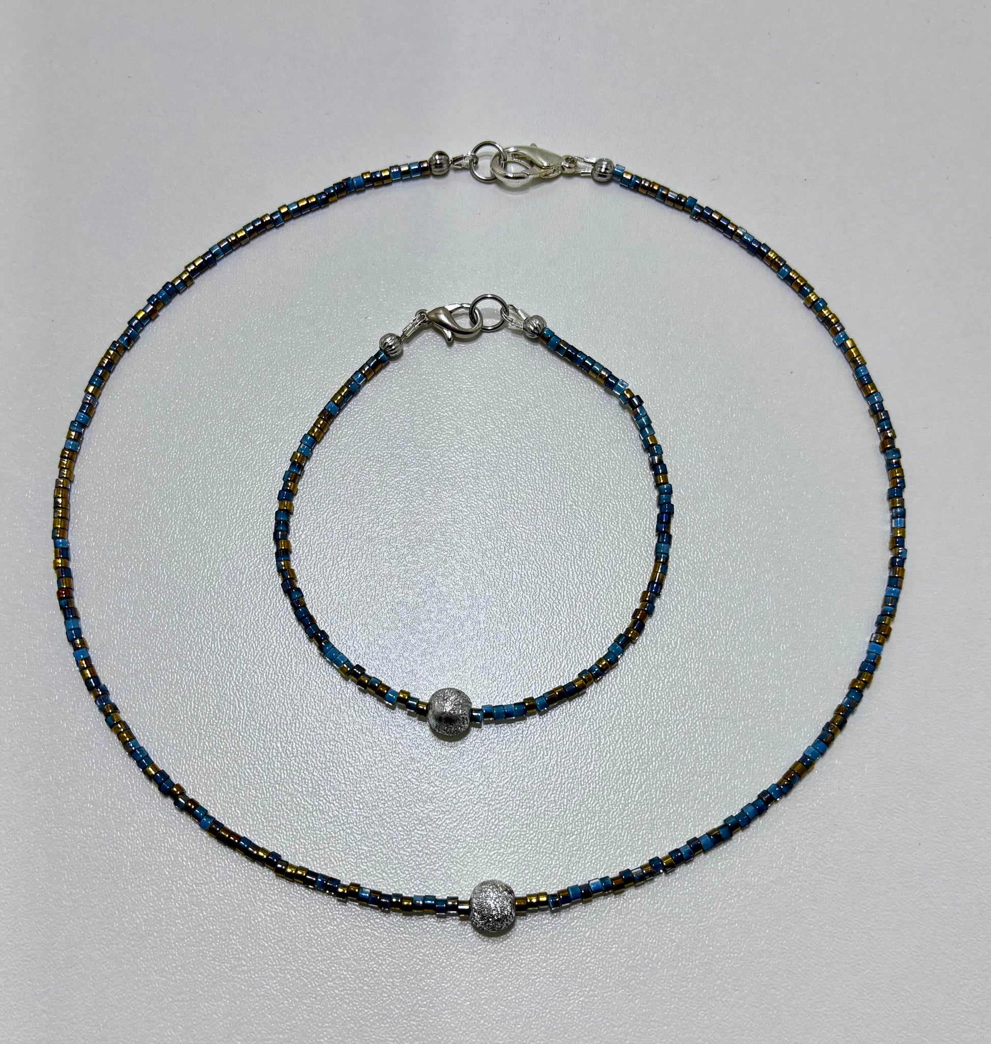 Mooie, fijne en subtiele, set van ketting en armbandje, gemaakt van hele kleine glaskraaltjes met een blauw/goude gloed. De set bestaat uit een ketting en een armbandje, beide afgewerkt met RVS zilverkleurig slotjes. Beiden hebben een zilverkleurige kraal als middelpunt.