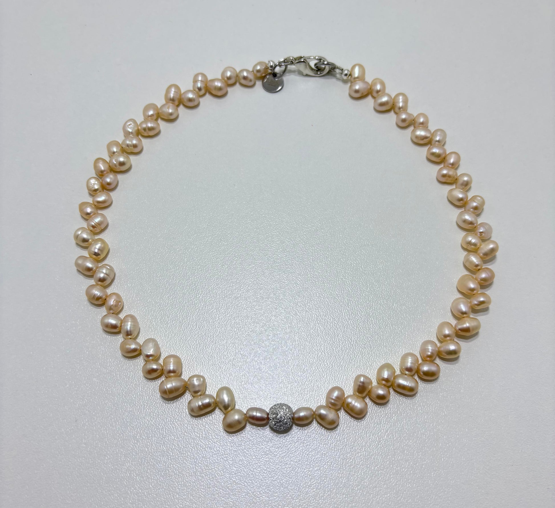 Mooie ketting, gemaakt van druppelvormige om&om perzik-kleurige zoetwaterparels afgewerkt met een zilverkleurig DQ metaal slotje.