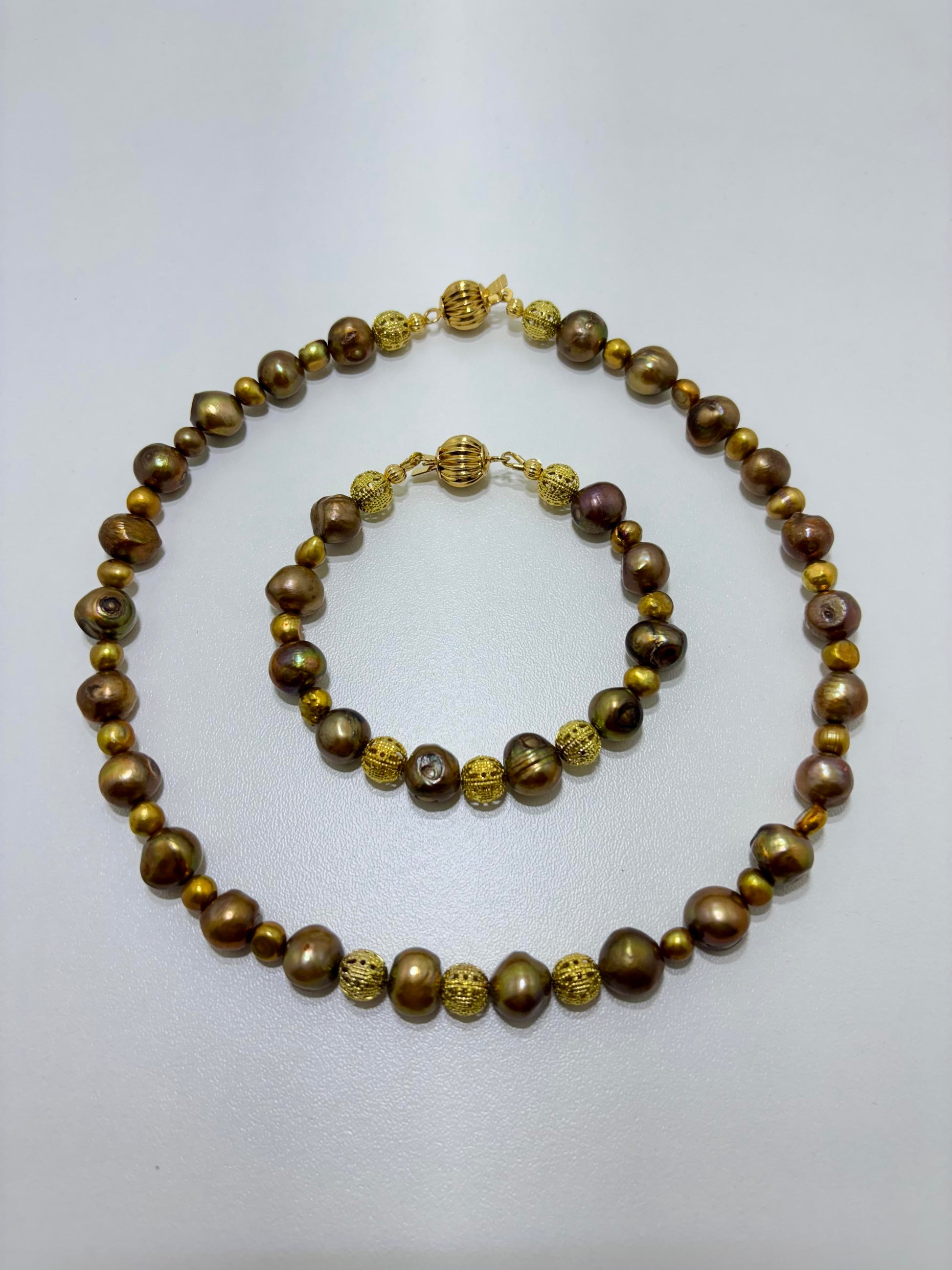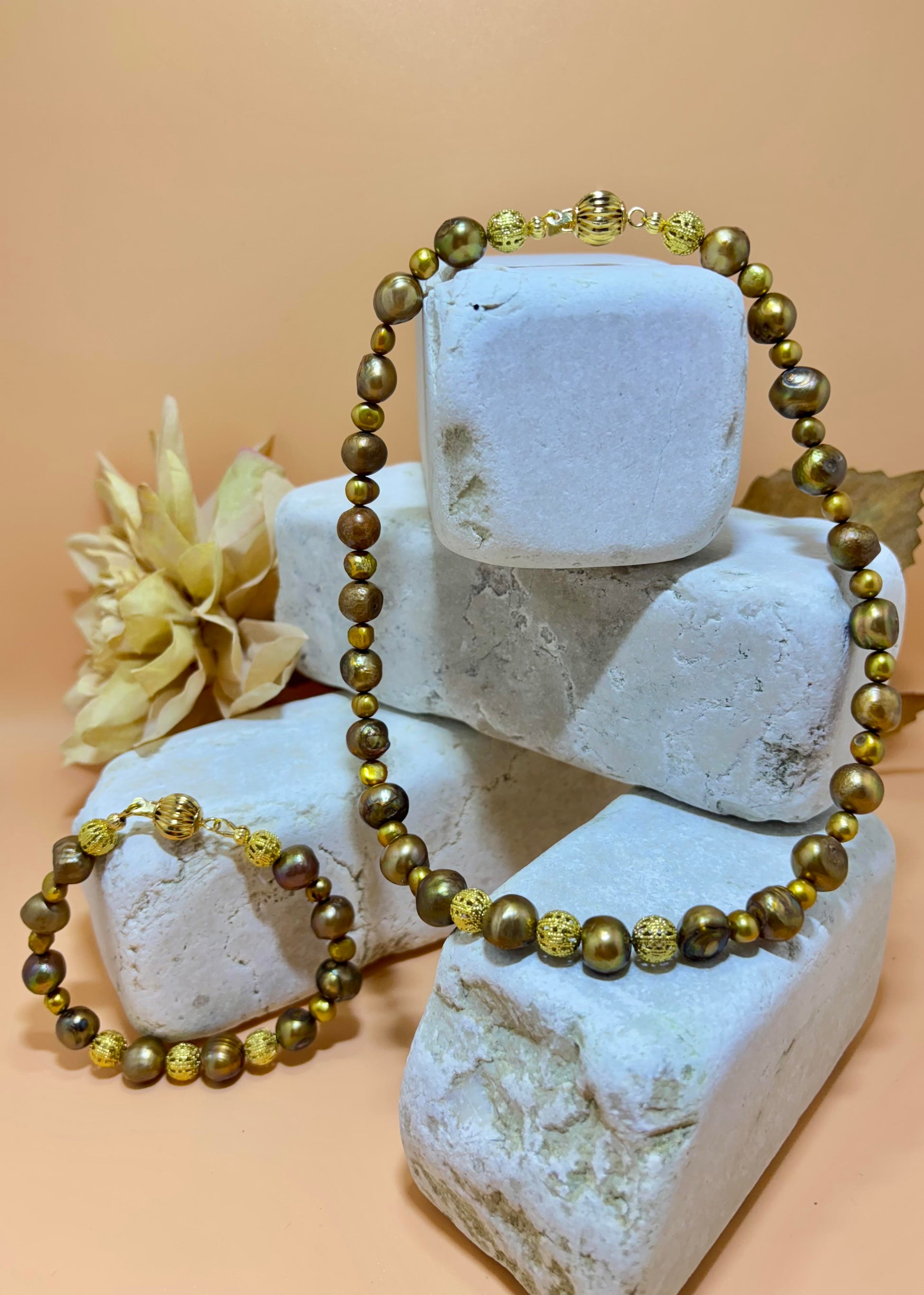 Mooie set van ketting en armband gemaakt van mosterd bruine zoetwaterparels in twee maten, afgewerkt met goudkleurige metalen kralen en een goudkleurig kunststof met RVS slotje wat mooi van kleur blijft.