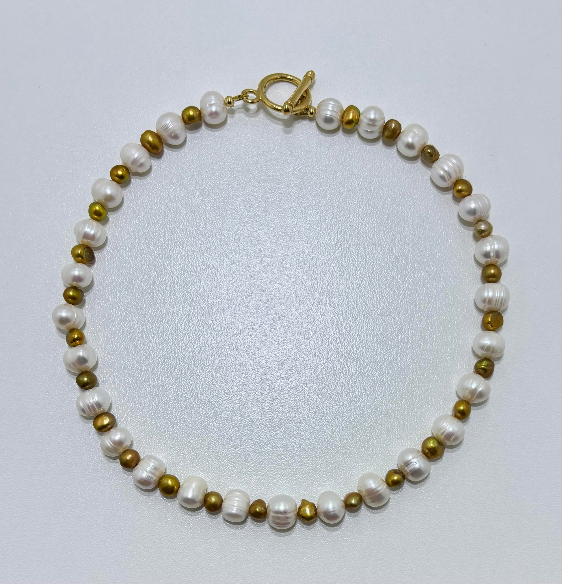 Mooie ketting, gemaakt van mosterd bruine zoetwaterparels afgewisseld met grote champagnekleurige zoetwaterparels afgewerkt met goudkleurige RVS slotjes.
