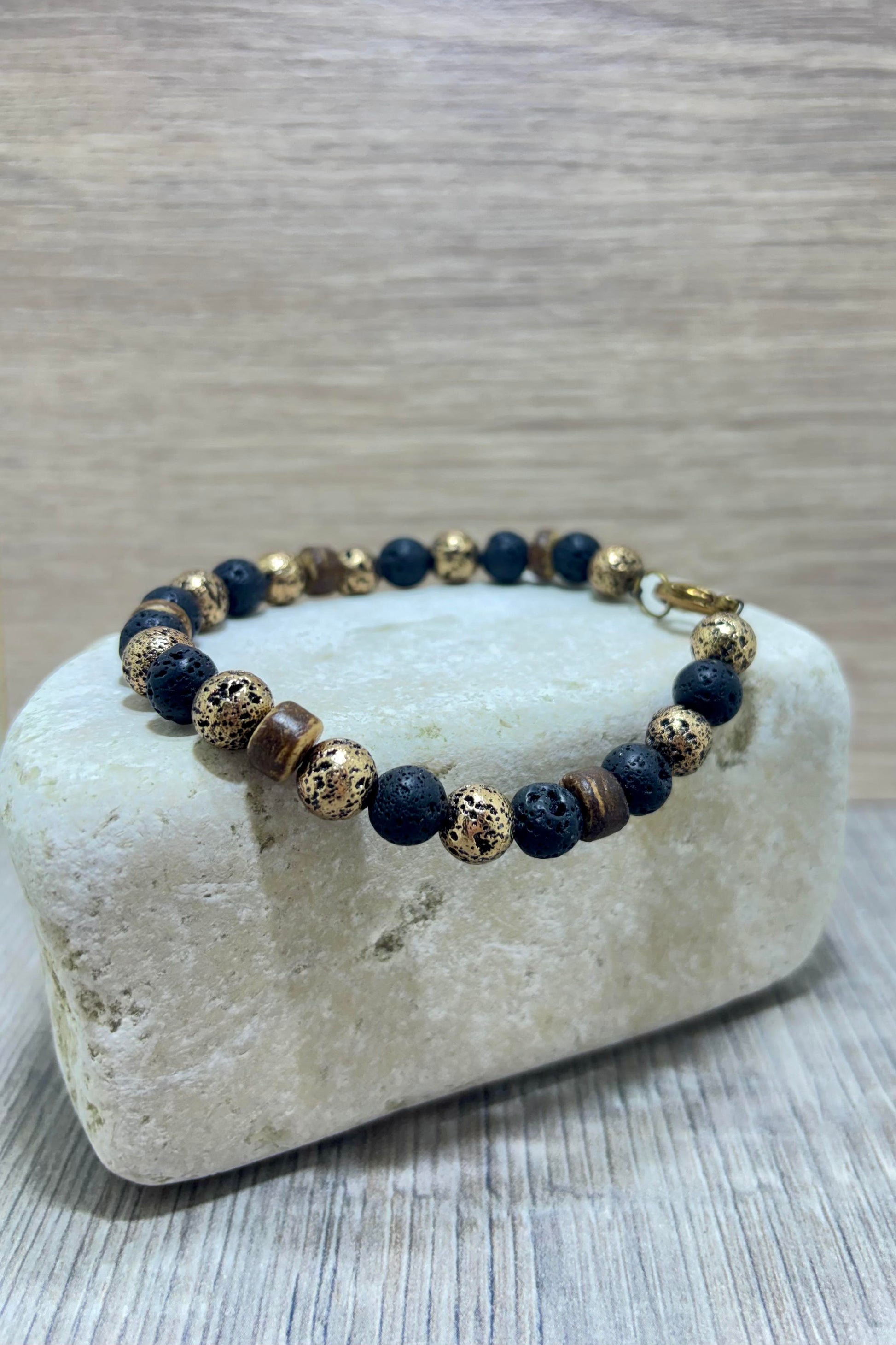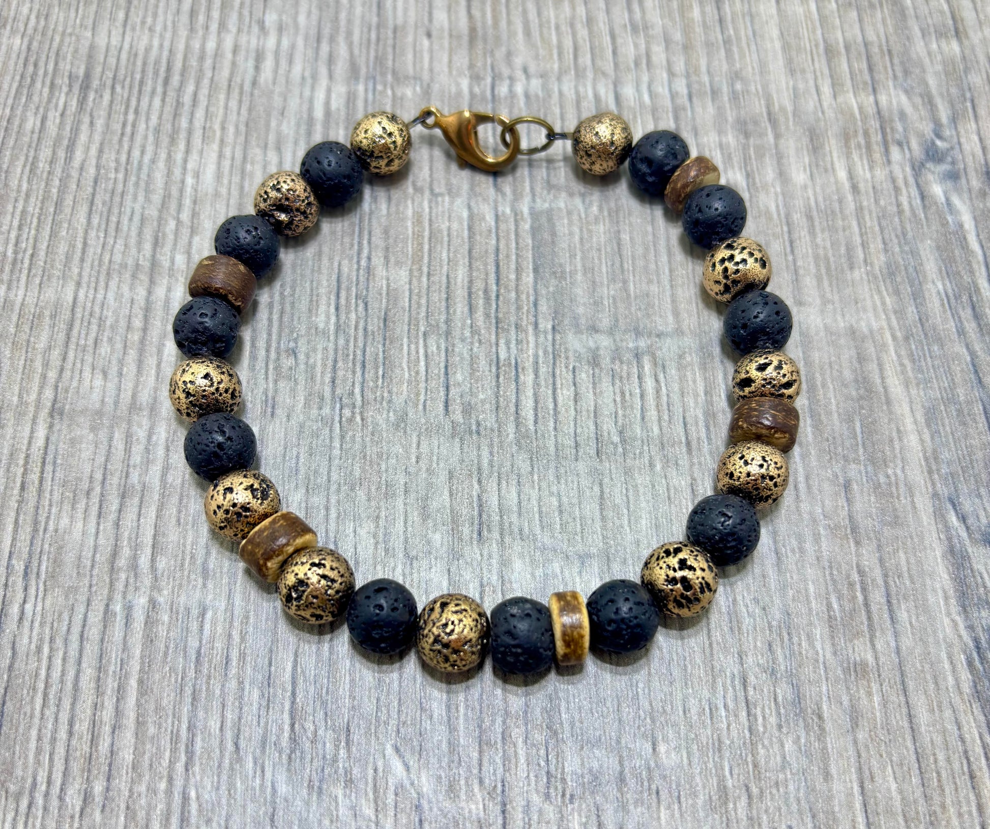 Armband gemaakt van 8mm zwarte en goudkleurige lavasteen kralen en houten kralen afgewerkt met een oud-koperkleurig RVS slotje. De lengte is 20,5 cm.
