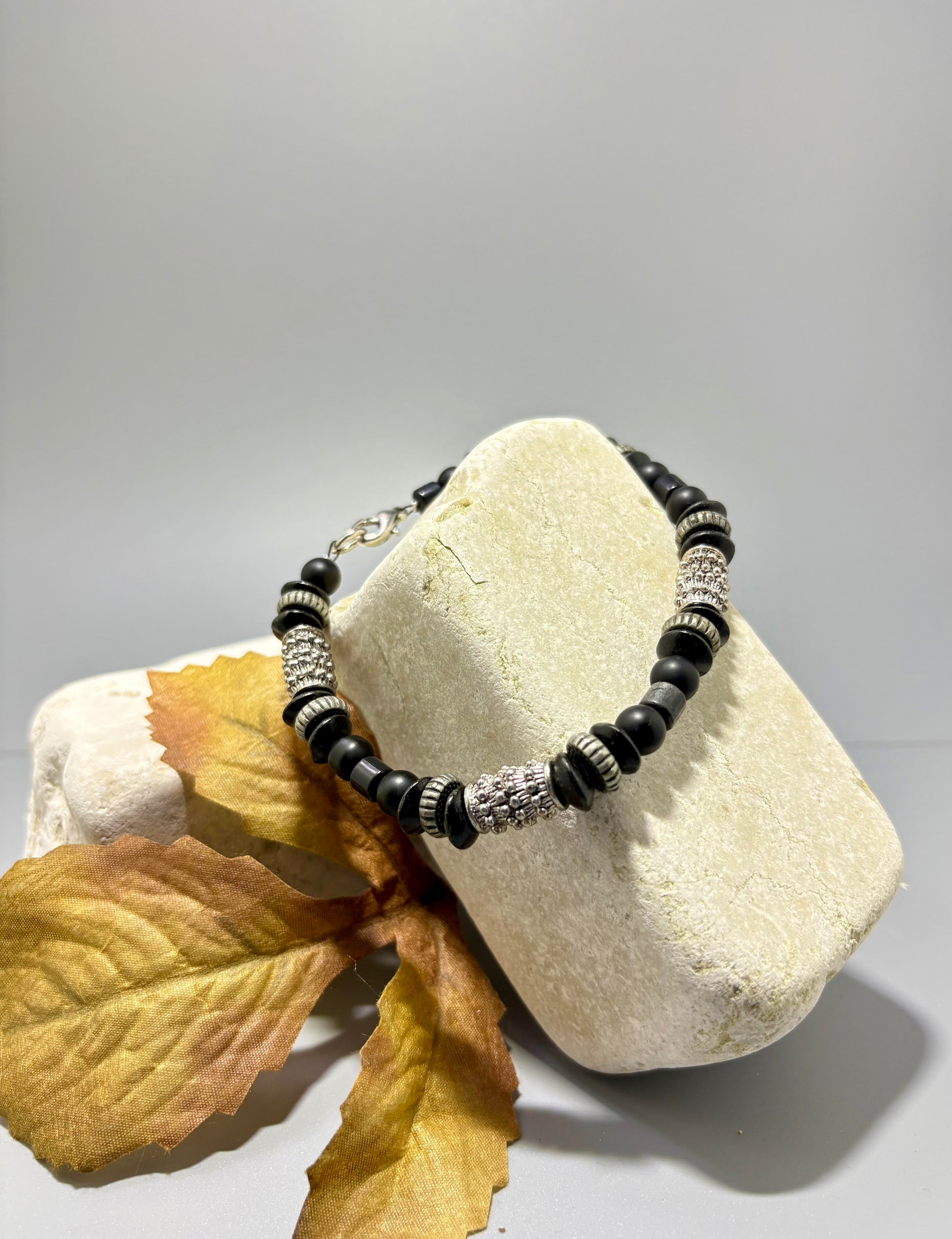 Armband gemaakt van mat zwarte glaskralen, houtkralen en bewerkte metalen kralen afgewerkt met een donker zilverkleurig RVS slotje. De lengte is 24 cm.