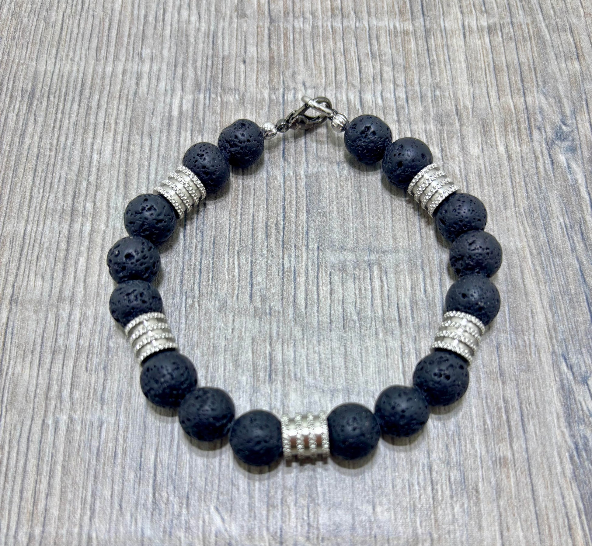 Armband gemaakt van 10mm zwarte lavasteen kralen metalen elementen, wat de armband een stoere robuuste uitstraling geeft. De armband heeft een antraciet RVS slot. De lengte is 21 cm.