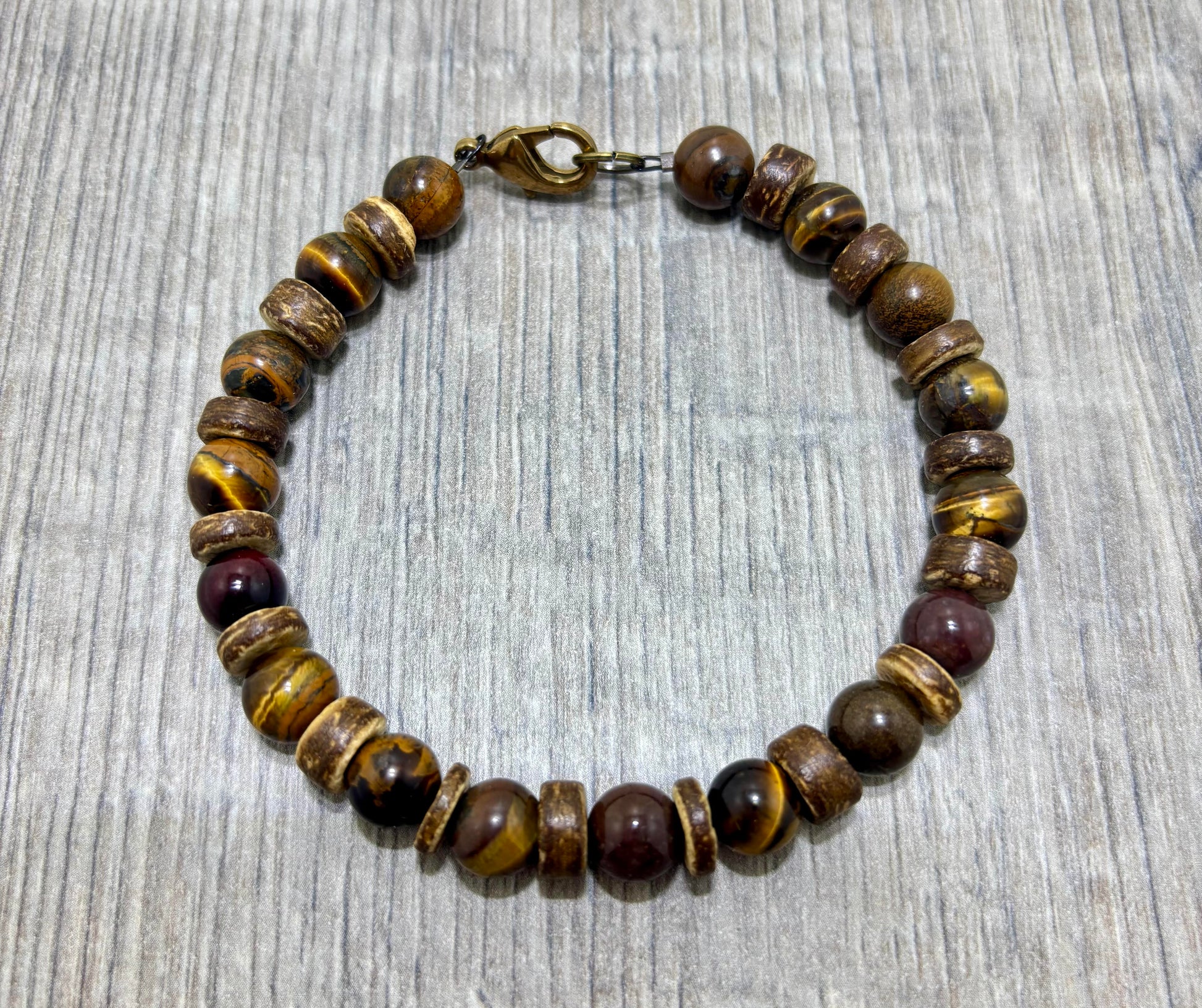 Armband gemaakt van 8mm tiger-eye kralen en houten kralen afgewerkt met een koperkleurig RVS slotje. De lengte is 20 cm.
