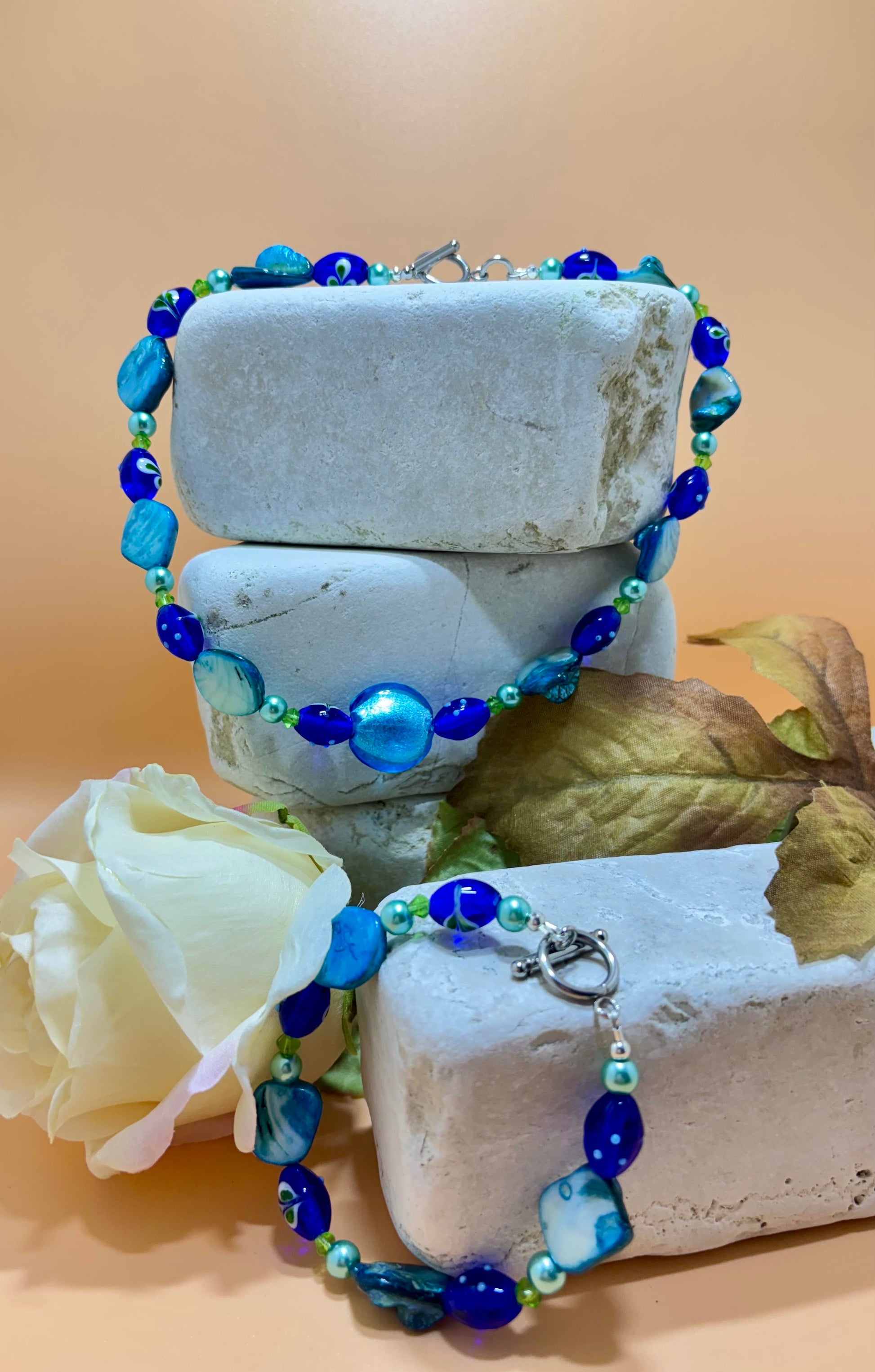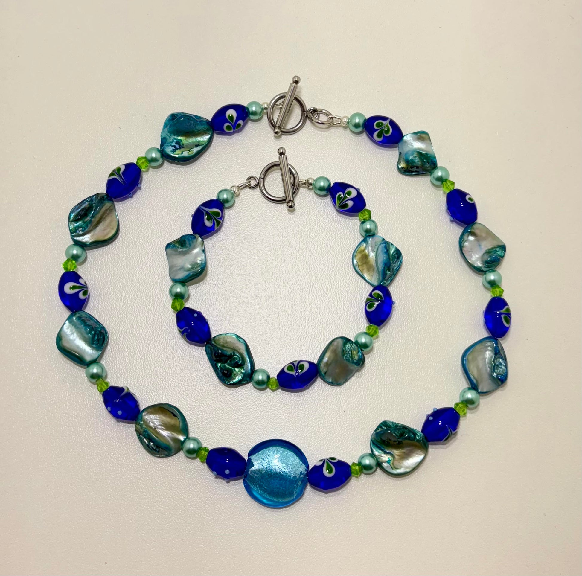 Set gemaakt van blauwe Keshi strand zoetwaterparels, beschilderde donkerder blauwe glaskralen en een grotere helblauwe glaskraal.