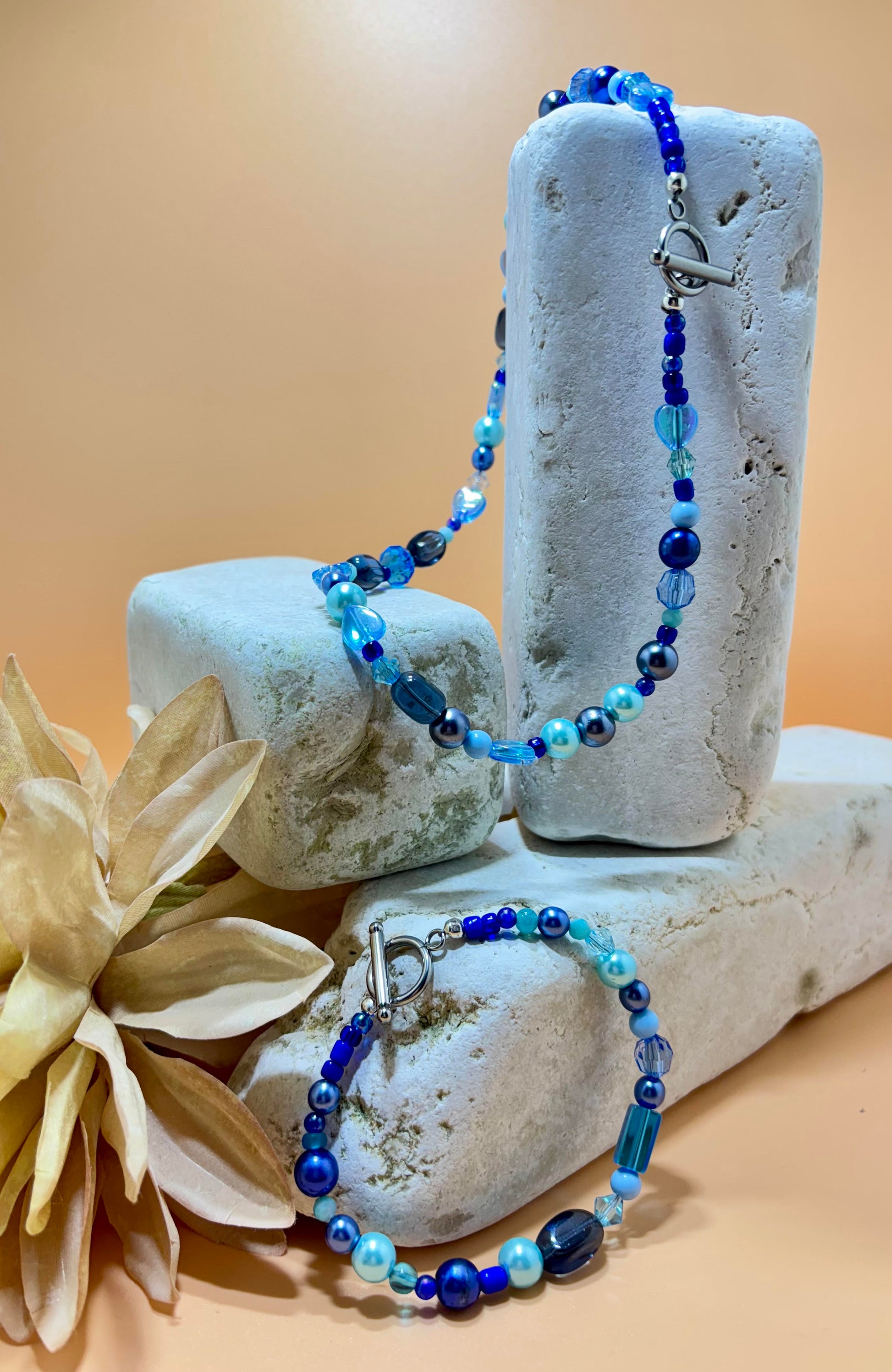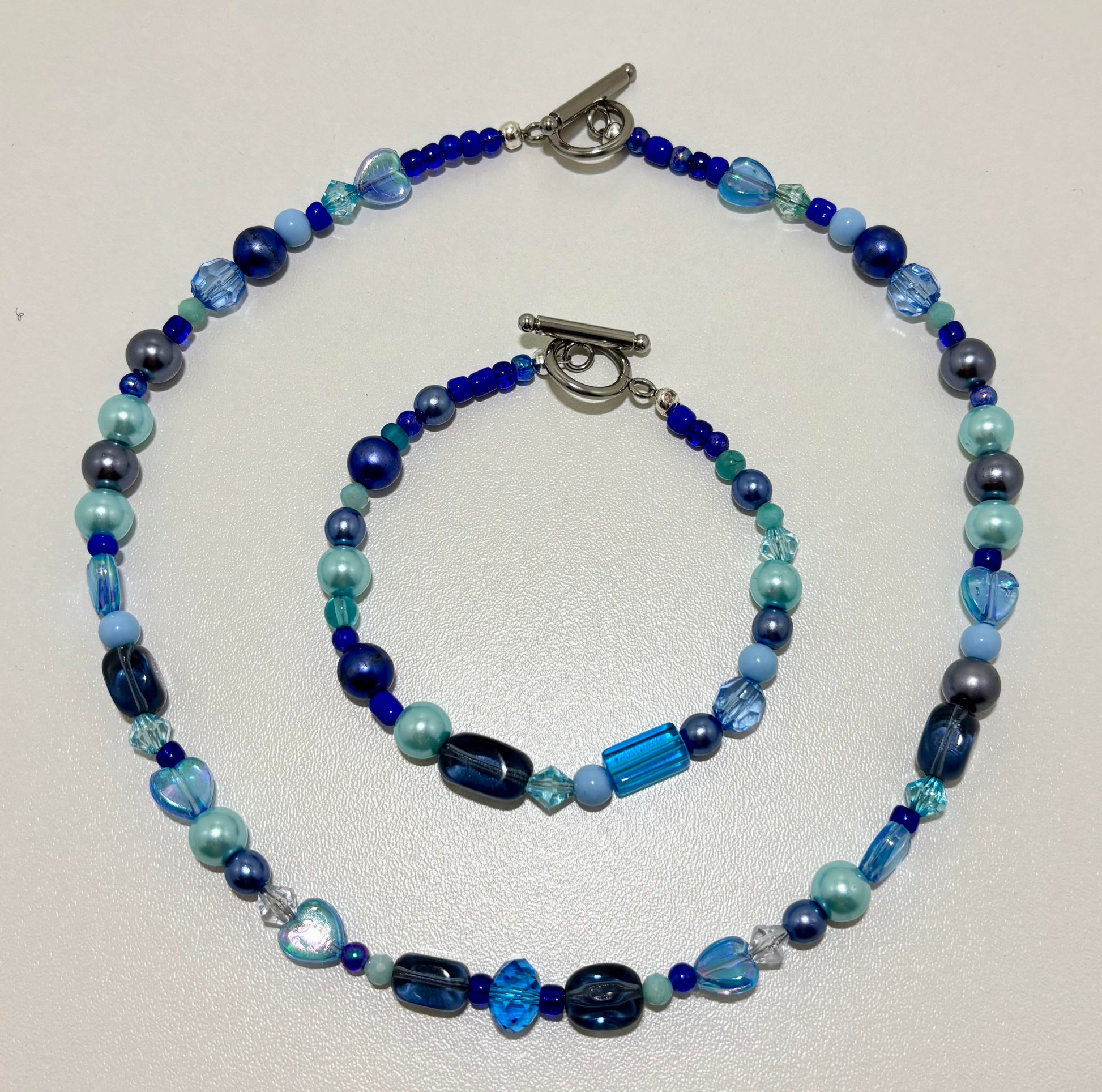 Set gemaakt van verschillende kleuren blauwe glaskralen. De set is afgewerkt met een DQ metaal kapittel slotje.