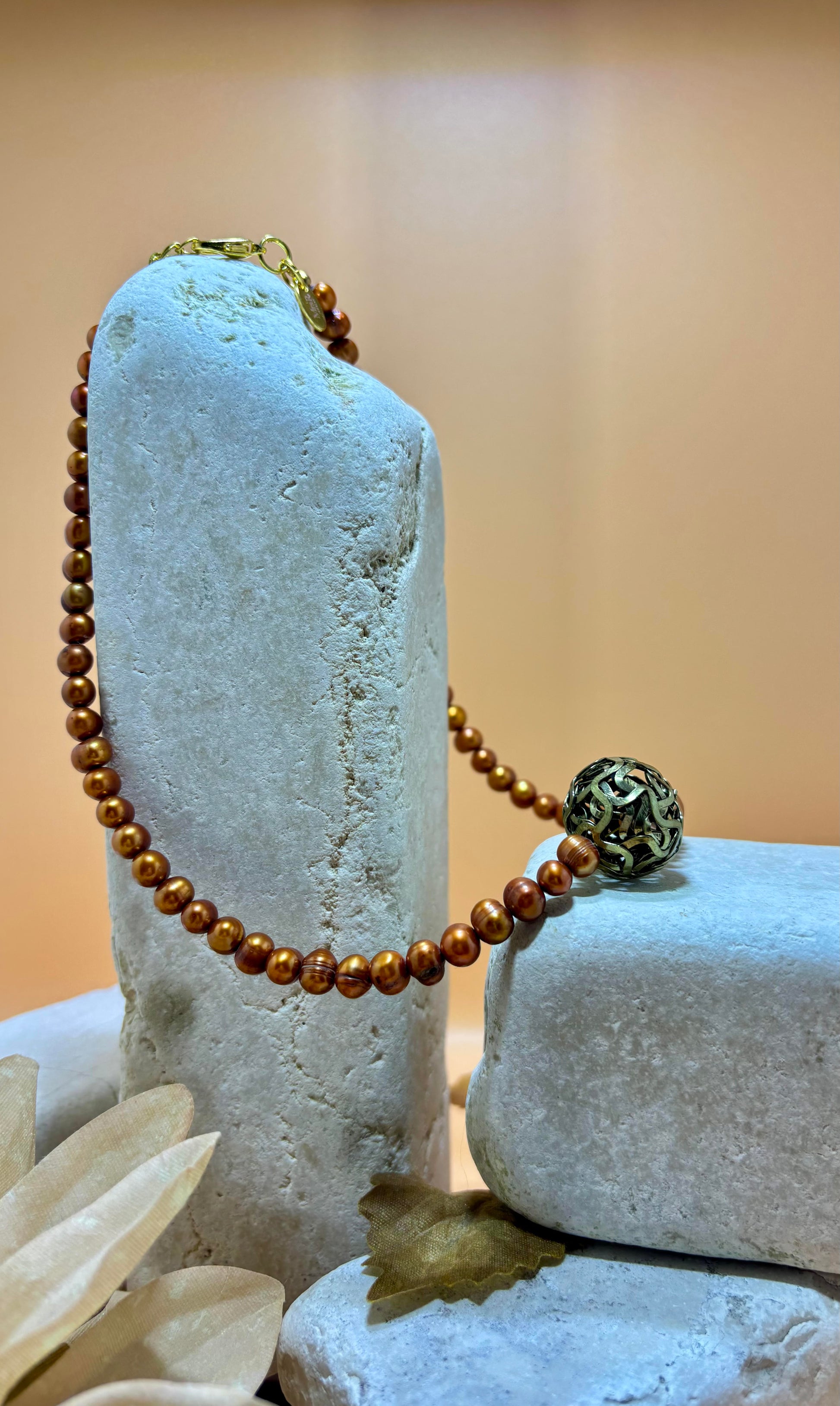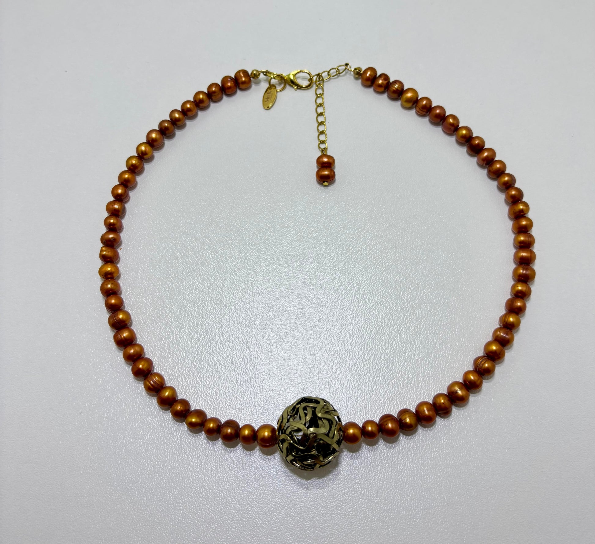 Mooie ketting, gemaakt van bronskleurige zoetwaterparels afgewerkt met een goudkleurig RVS slotje. Het middelpunt is een grotere metalen kraal, gemaakt van door elkaar lopende linten van metaal.