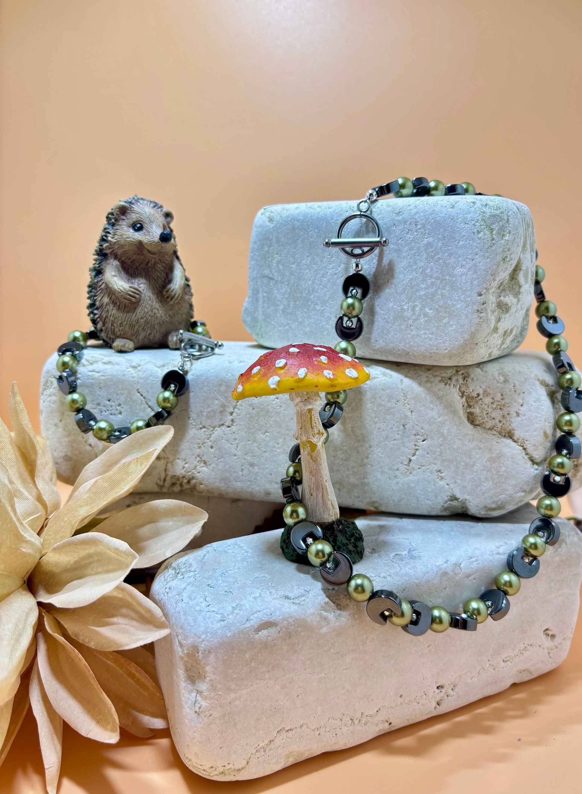 Prachtige set van Hematiet kralen afgewisseld met mos groene glaskralen. Afgewerkt met DQ metaal kapittelslotjes.