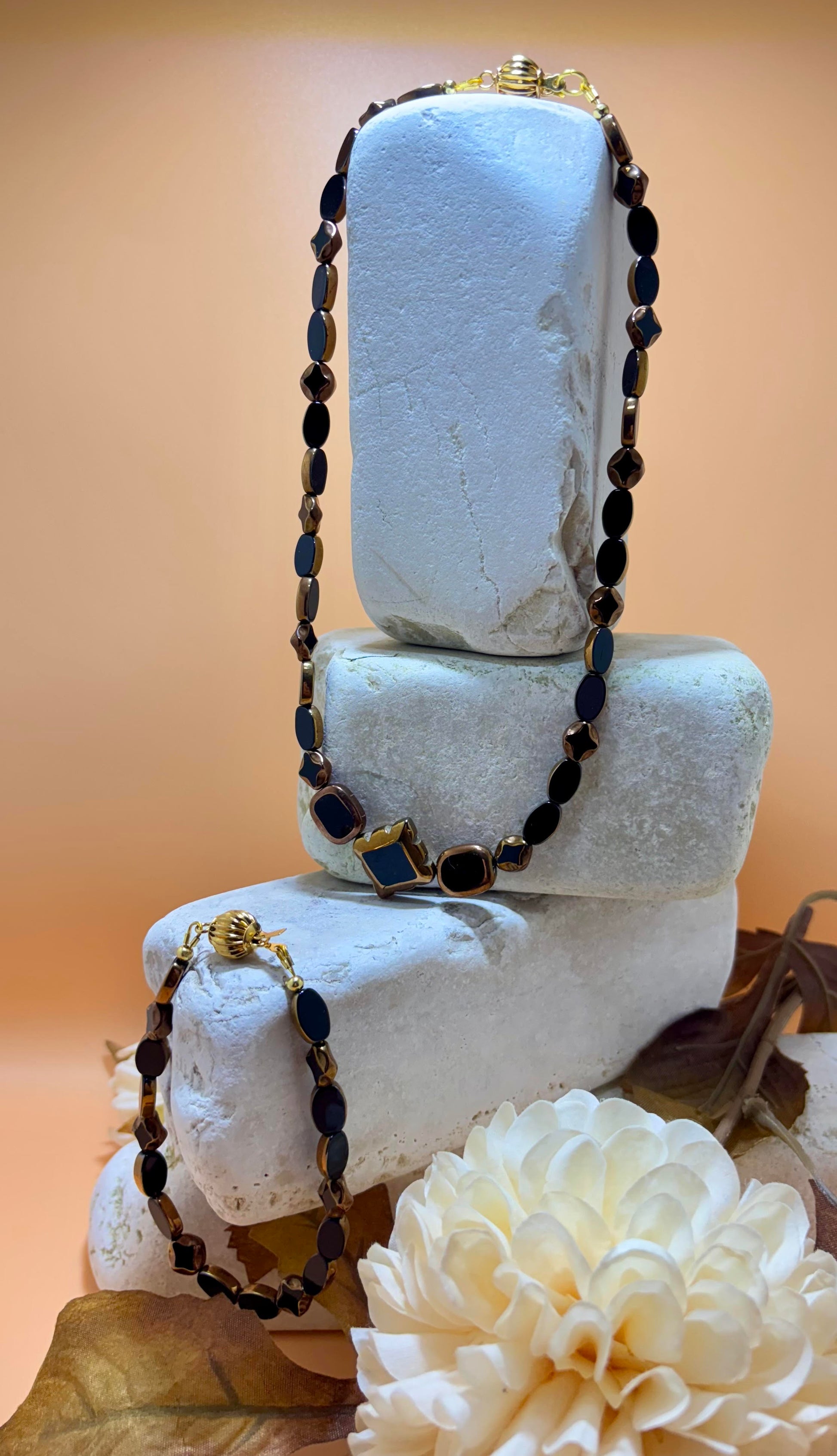 Prachtige set van zwarte electroplated glaskralen. Hierdoor krijgt de set een mysterieuze uitstraling. . Afgewerkt met een stevig goudkleurig slotje wat mooi van kleur blijft.