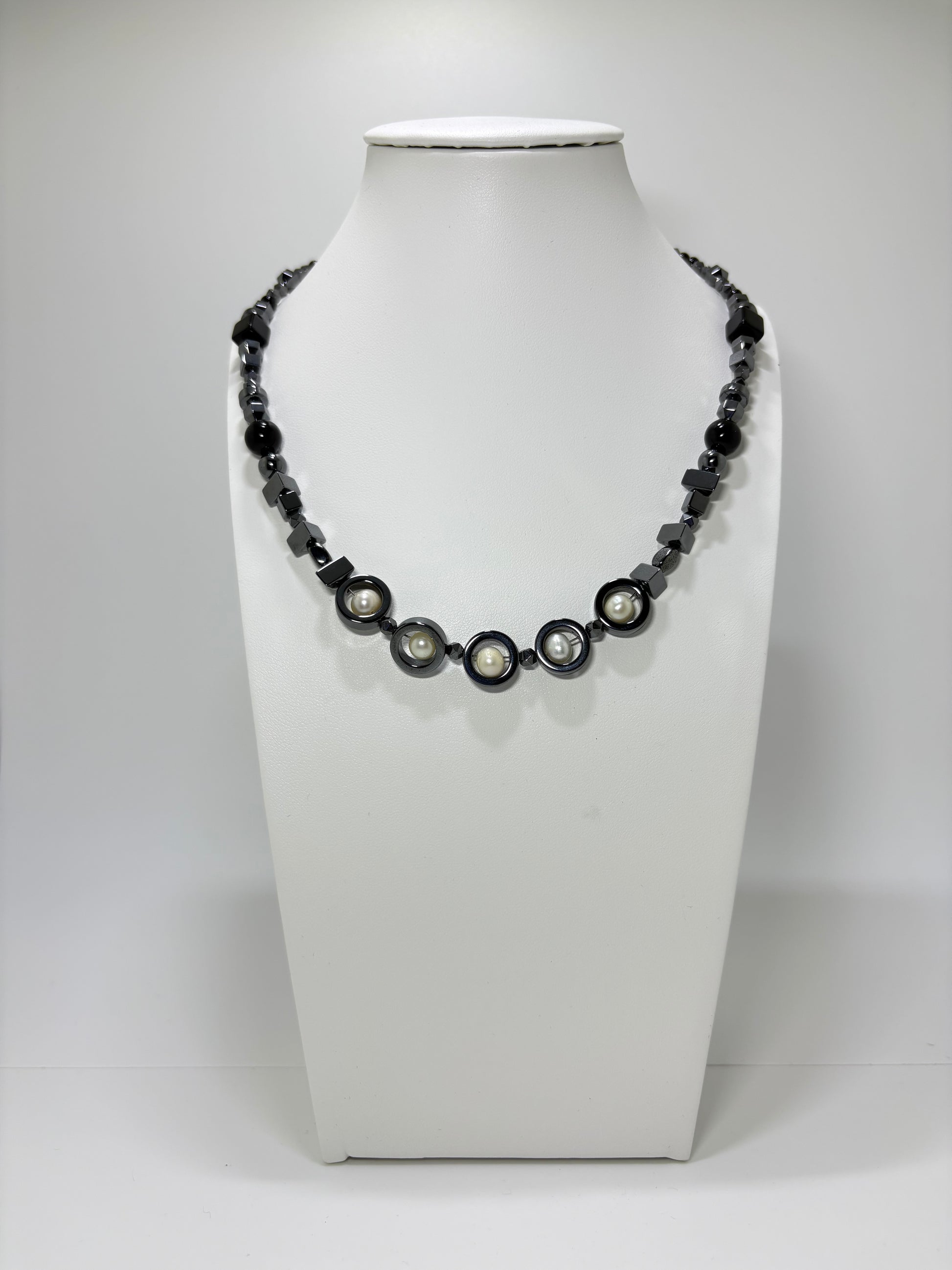 De ketting is niet alleen een visueel statement, maar draagt ook de aardende en beschermende eigenschappen van hematiet, terwijl de parels een symboliek van zuiverheid, schoonheid en luxe toevoegen. De verschillende vormen en maten van de hematietkralen zorgen voor een dynamisch effect, terwijl de parels de halsketting een verfijnde en chique uitstraling geven.