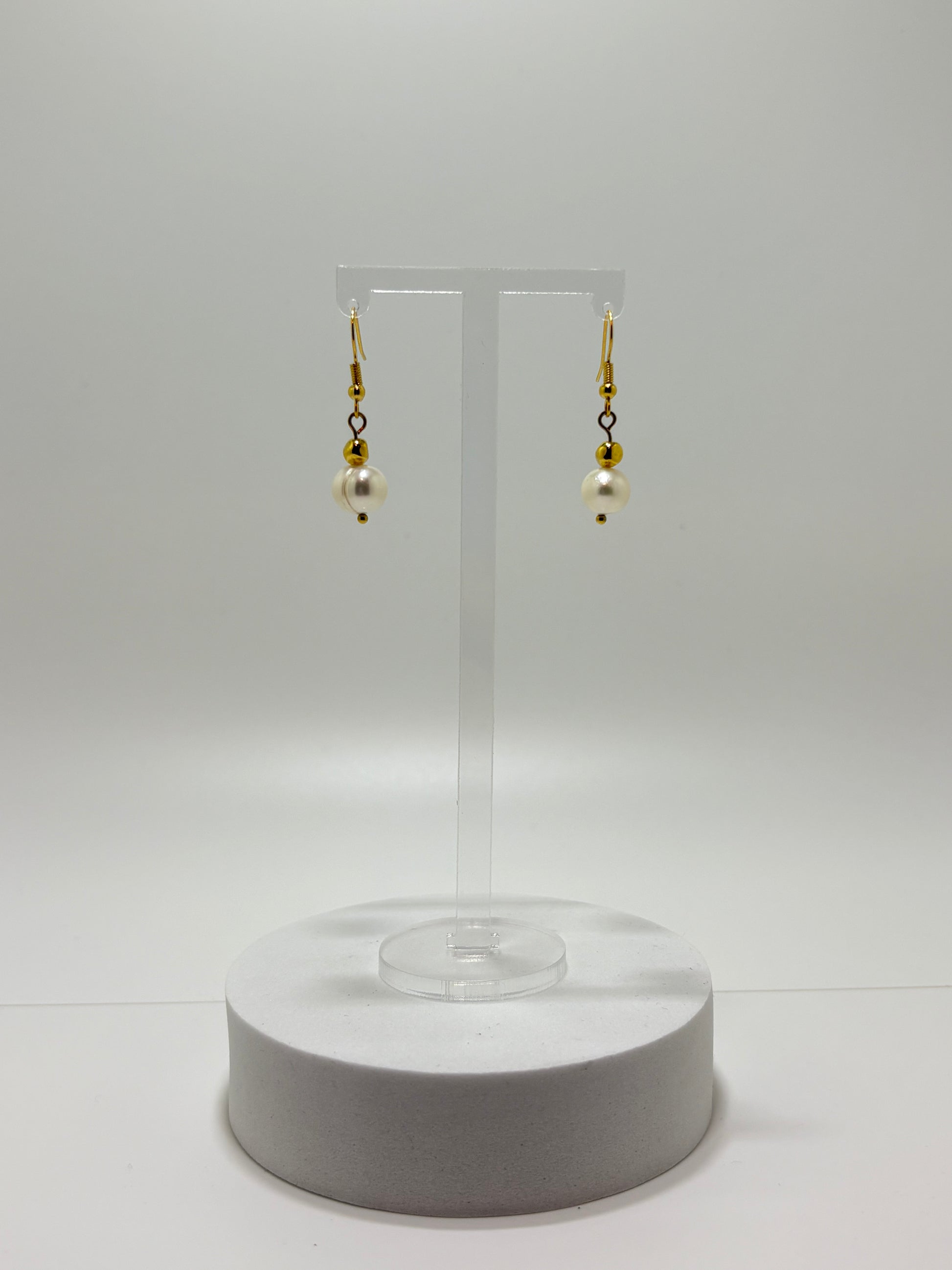 Oorbellen behorende bij de Elegance in Pearls halsketting. Gemaakt van zoetwaterparels en goudkleurig DQ metaal.