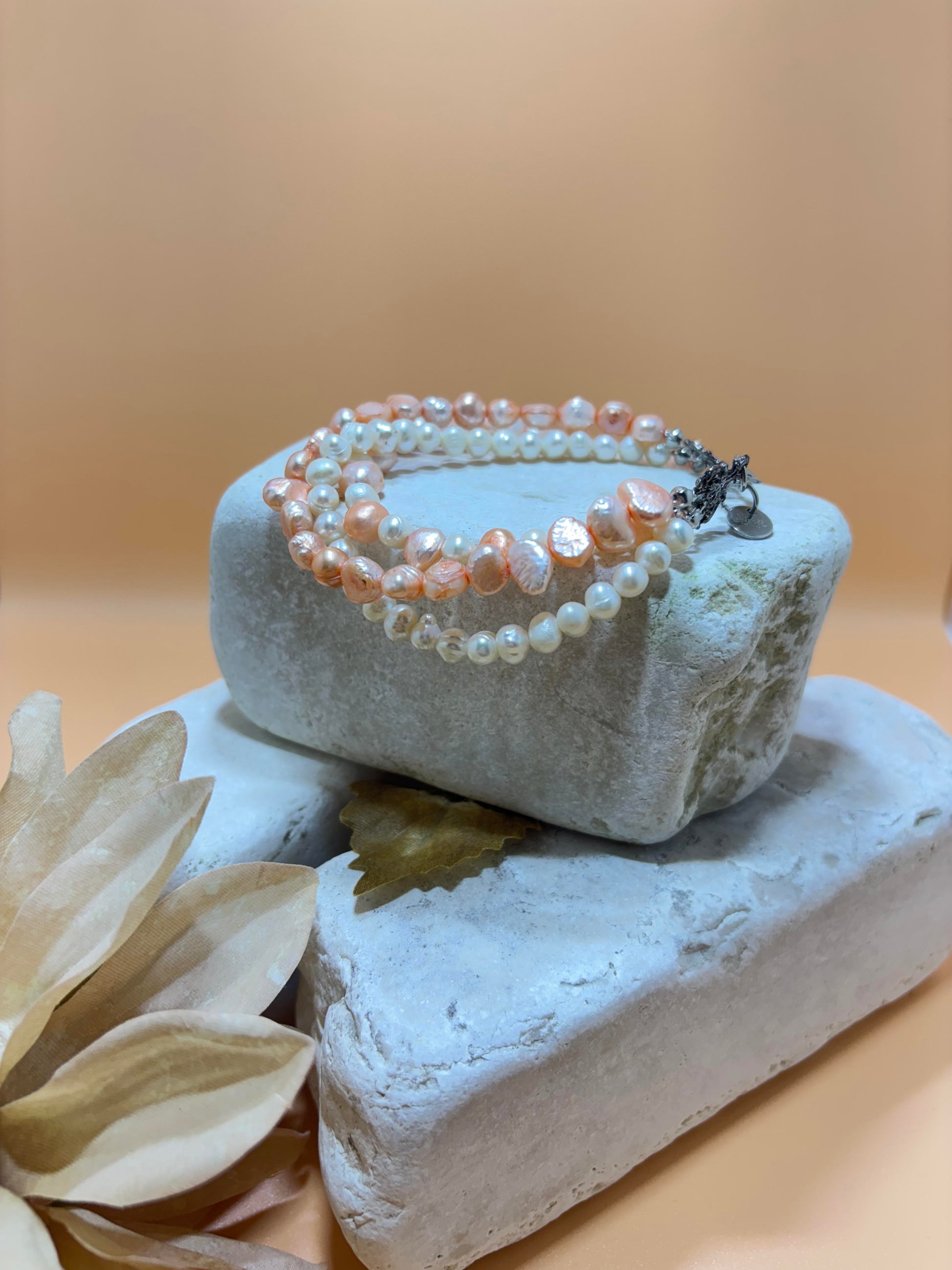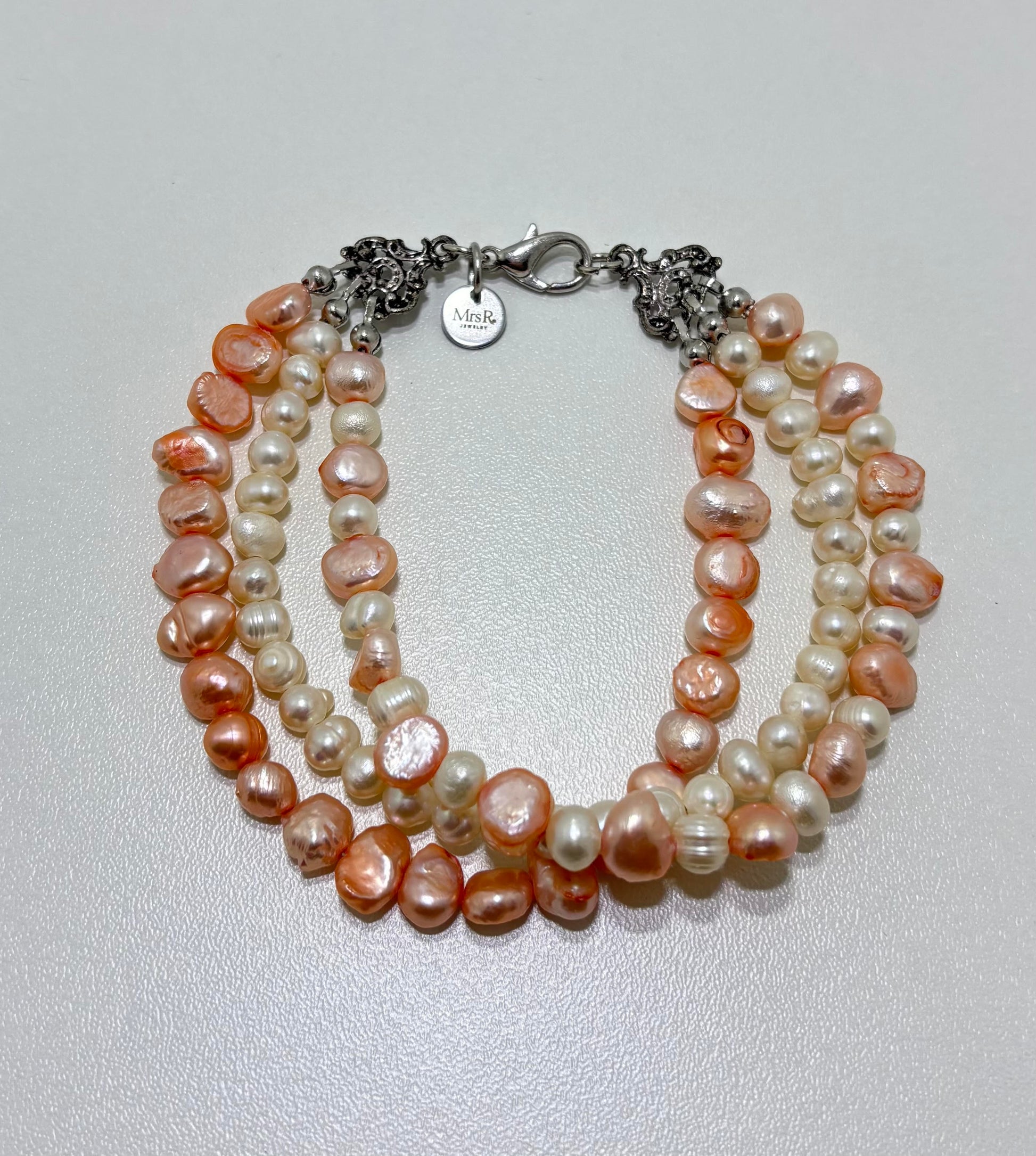 Mooie armband, gemaakt van drie strengen perzik- en champagne kleurige zoetwaterparels afgewerkt met oud-zilverkleurige metalen eindstukken en een zilverkleurig RVS slotje.