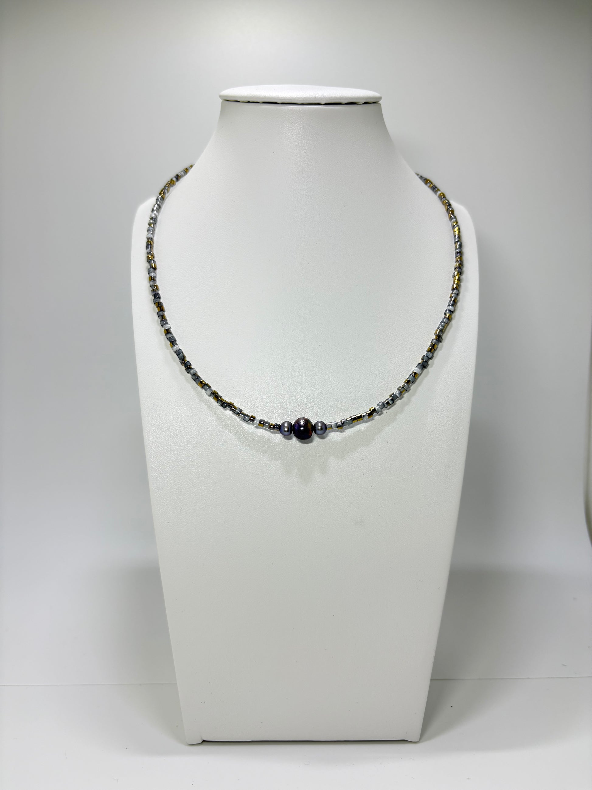Mooi, fijn en subtiel halskettinkje, gemaakt van hele kleine glaskraaltjes met een blauw/goude gloed. De halsketting is afgewerkt met een RVS zilverkleurig slotje. De halsketting heeft drie paarse zoetwaterpareltjes met olie-achtige gloed als middelpunt.