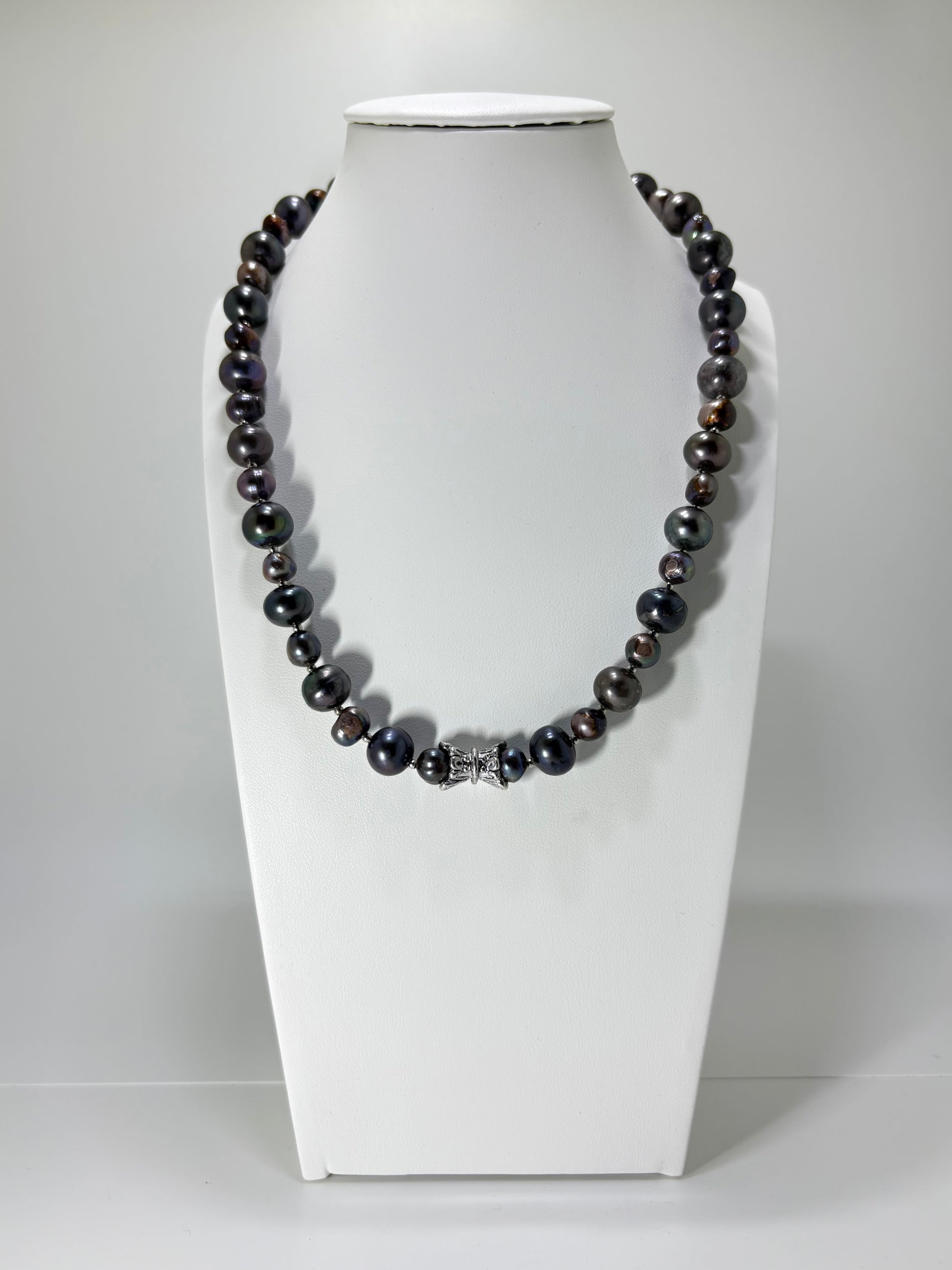 Prachtige, koninklijk uitziende halsketting, gemaakt van hele mooie grote paars/bruine zoetwaterparels met een olie achtige gloed. De ketting doet heel chique aan door de afwerking met metalen elementen in een oud zilverkleur. De ketting is afgewerkt met een DQ metaal zilverkleurig slotje.