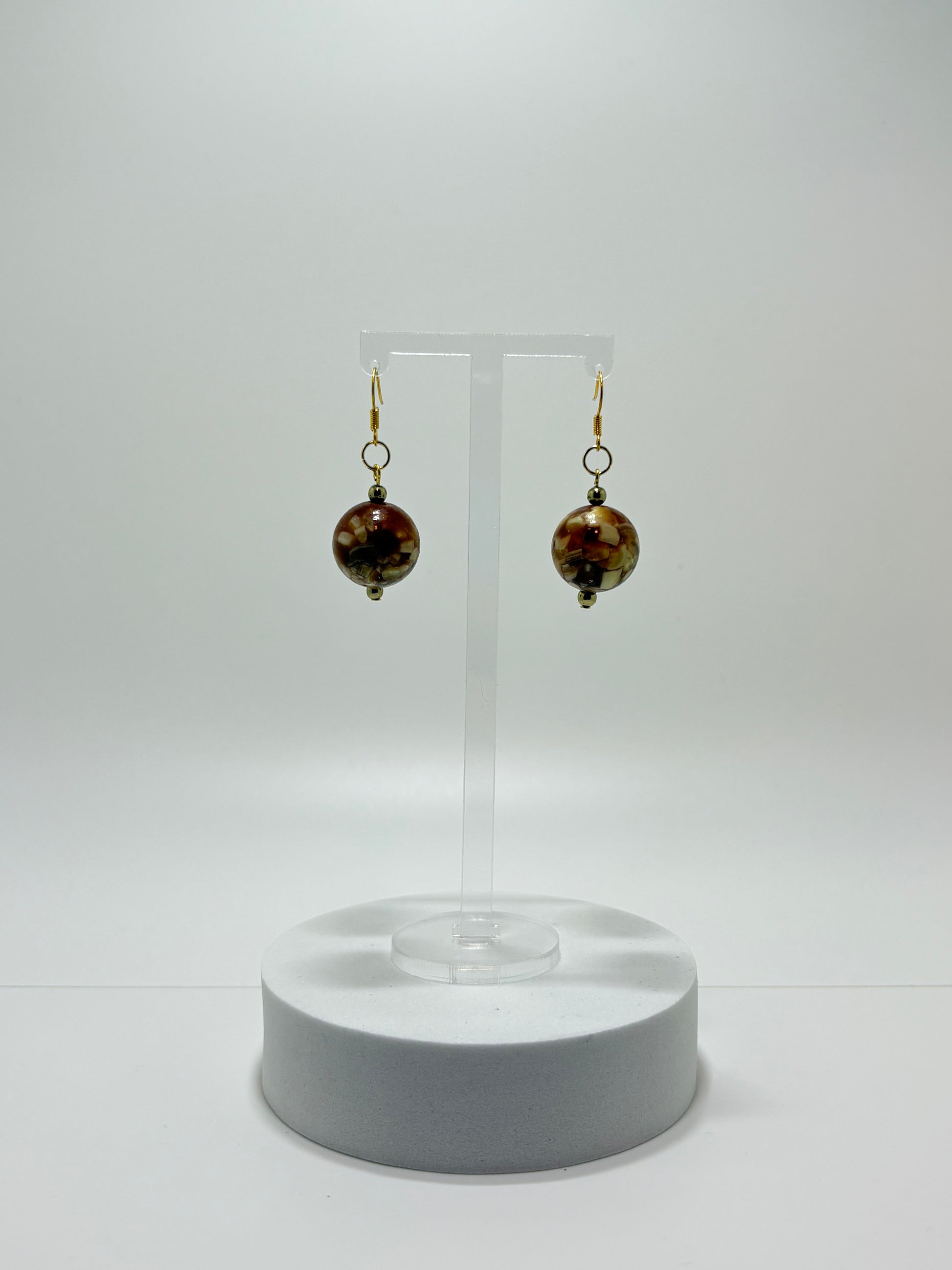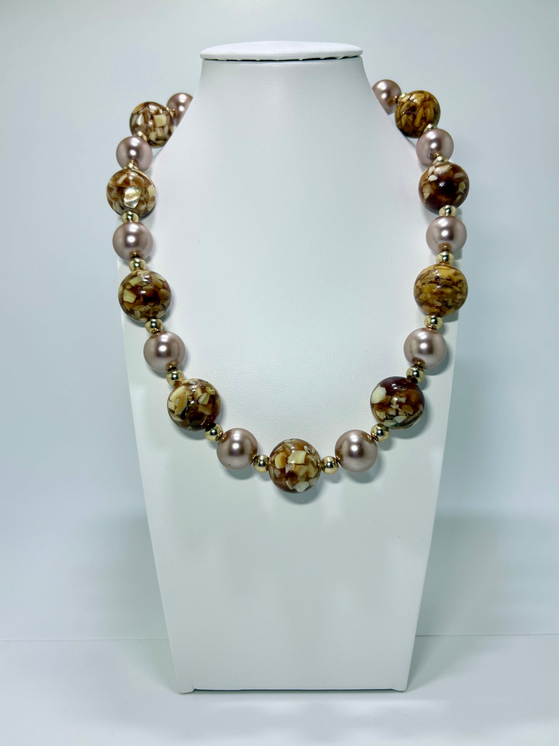 Mooie zware halsketting van taupe/bruine harskralen en glaskralen afgewerkt met een DQ metaal goudkleurig slotje.