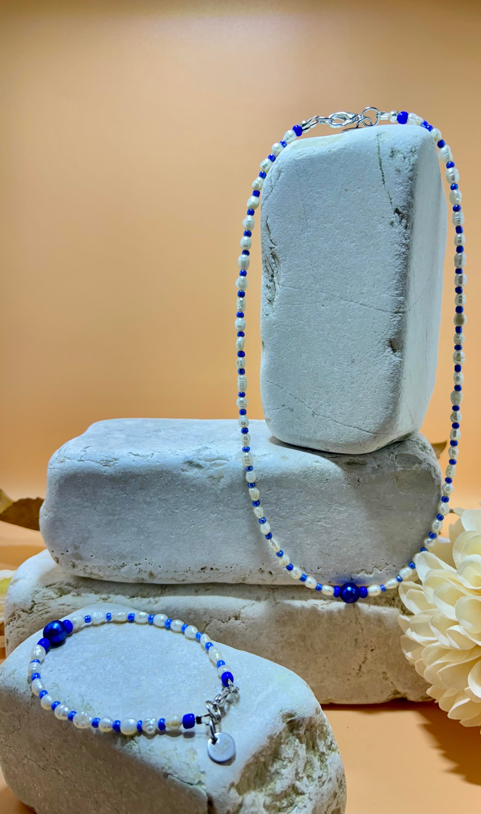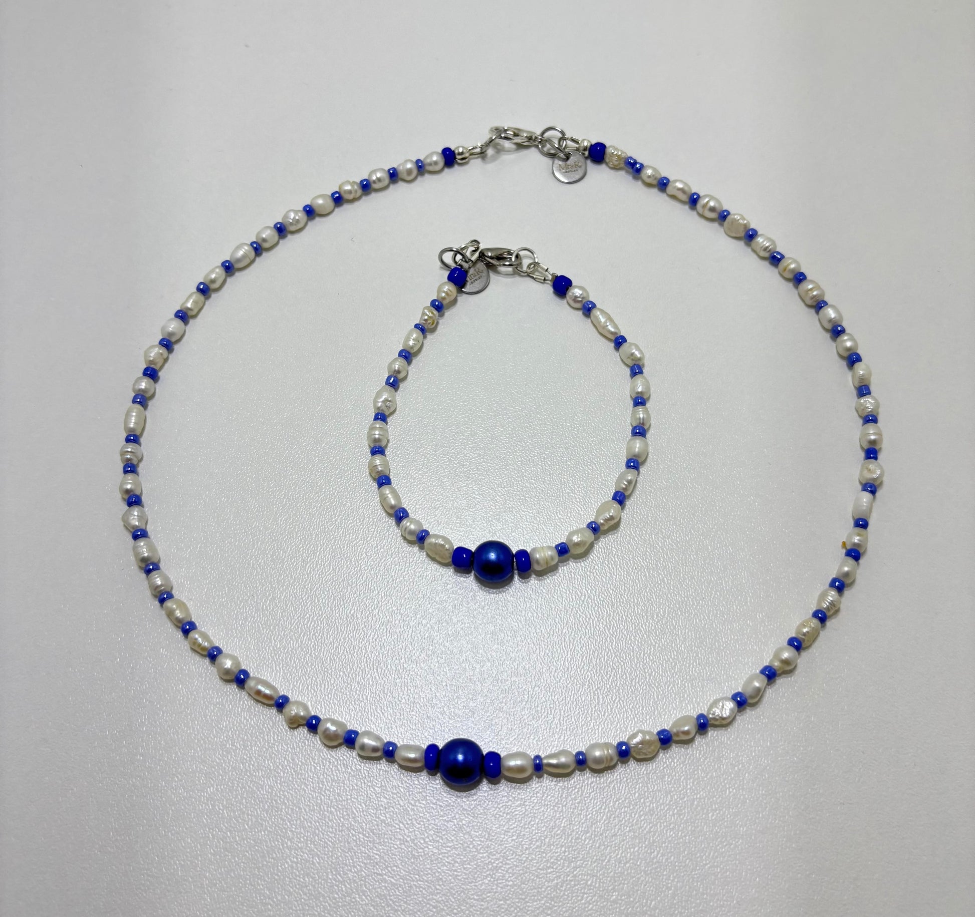Mooie, fijne en subtiele, set van ketting en armbandje, gemaakt van hele kleine zoetwaterpareltjes met een blauwe glaskraal als koninklijk middelpunt. De set bestaat uit een ketting en een armbandje, beide afgewerkt met DQ metaal zilverkleurig slotjes.