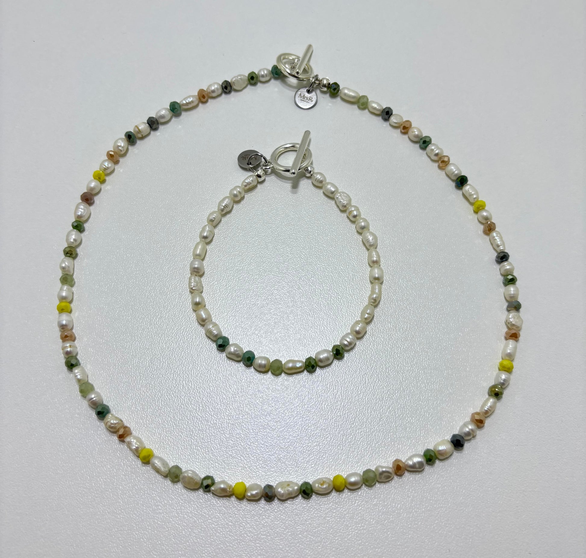 Mooie, fijne en subtiele, set van ketting en armbandje, gemaakt van hele kleine zoetwaterpareltjes afgewisseld met verschillende kleuren glimmende facetkraaltjes. De set bestaat uit een ketting en een armbandje, beide afgewerkt met DQ metaal zilverkleurig slotjes.