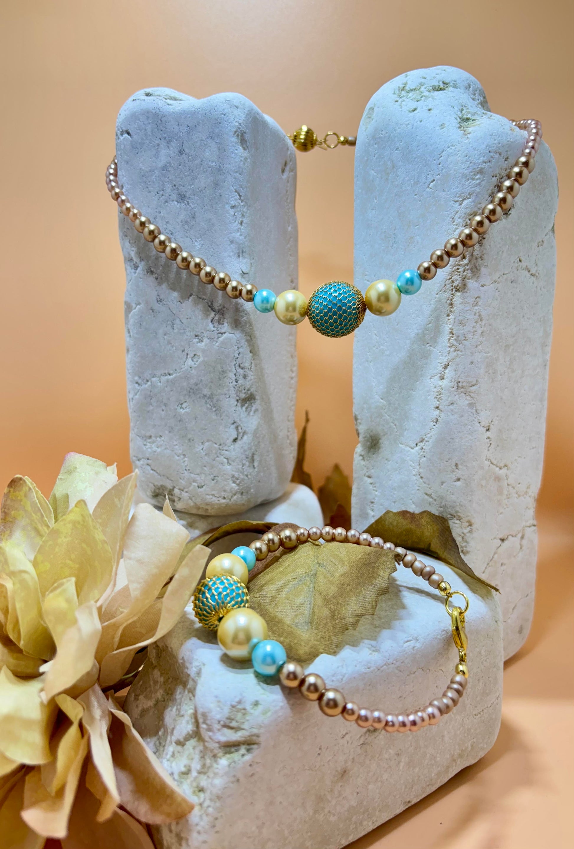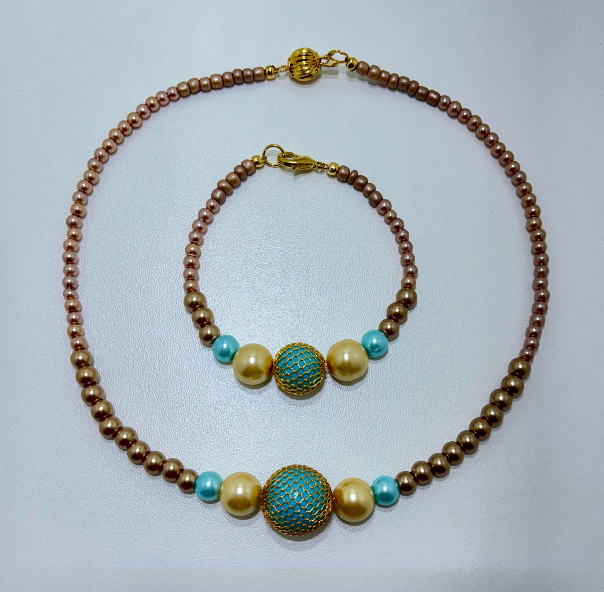 Goudkleurige gedipte glasparels met een koninklijke kraal als middelpunt. Set van ketting (40 cm) & armband (19 cm)