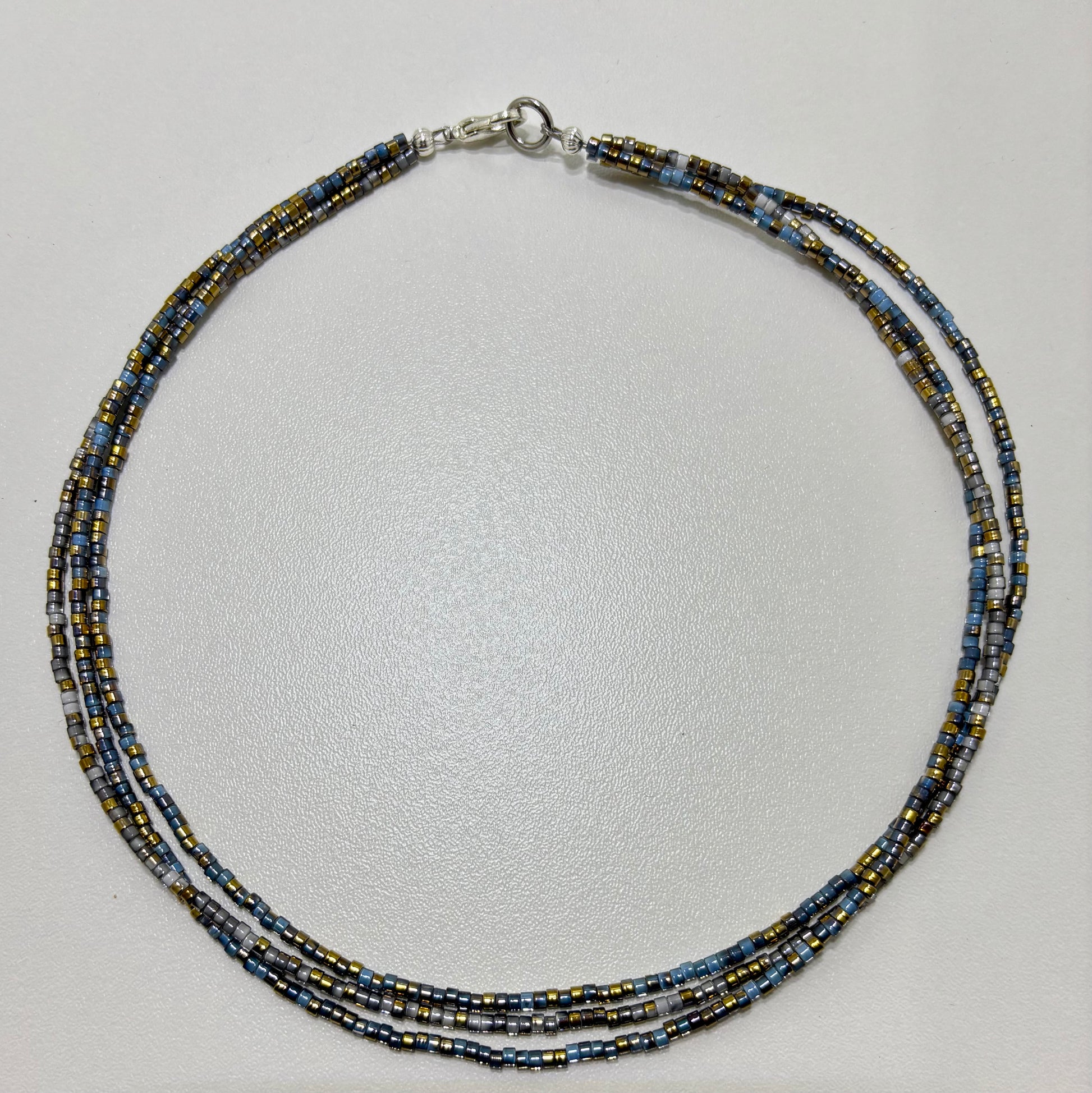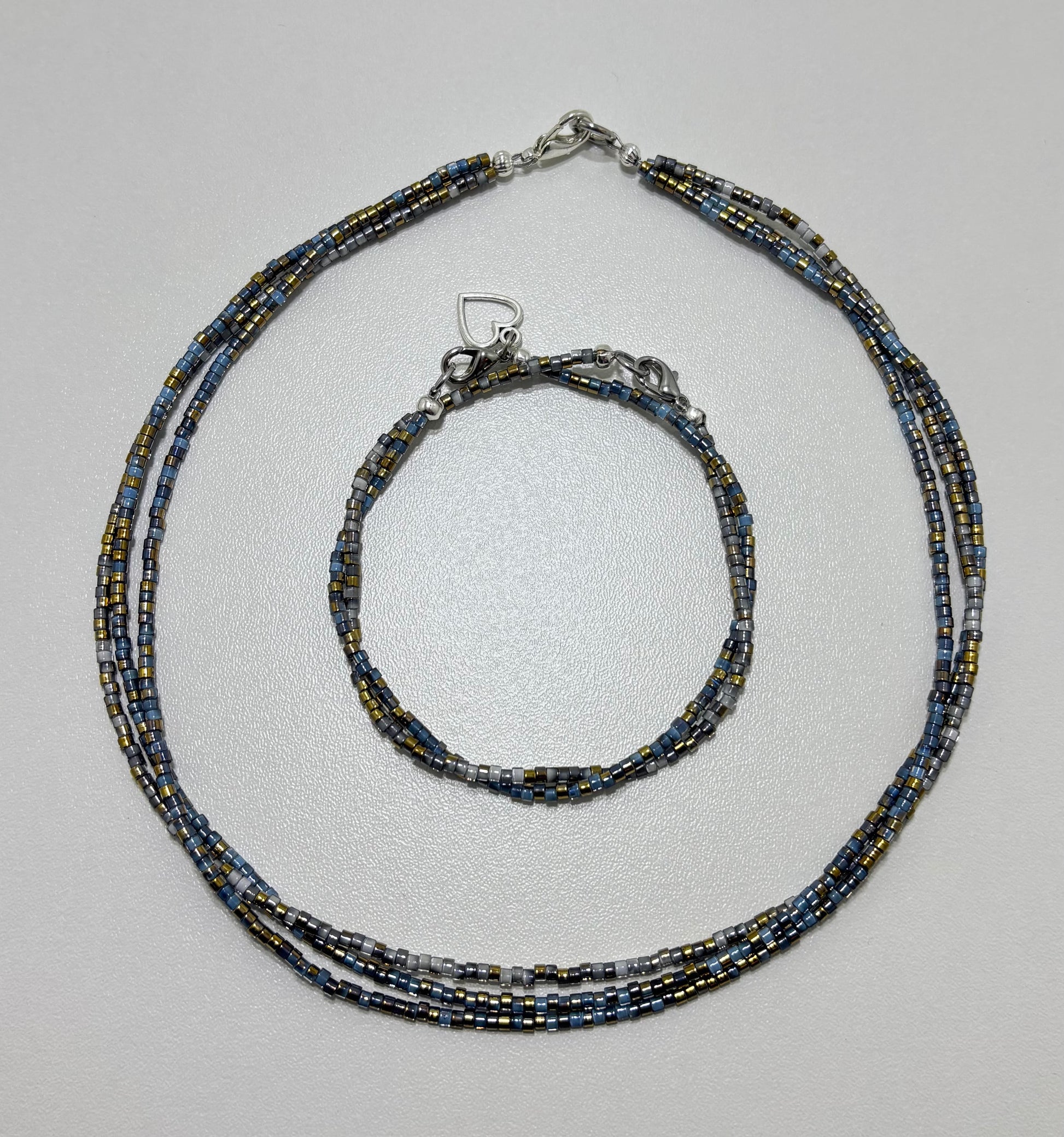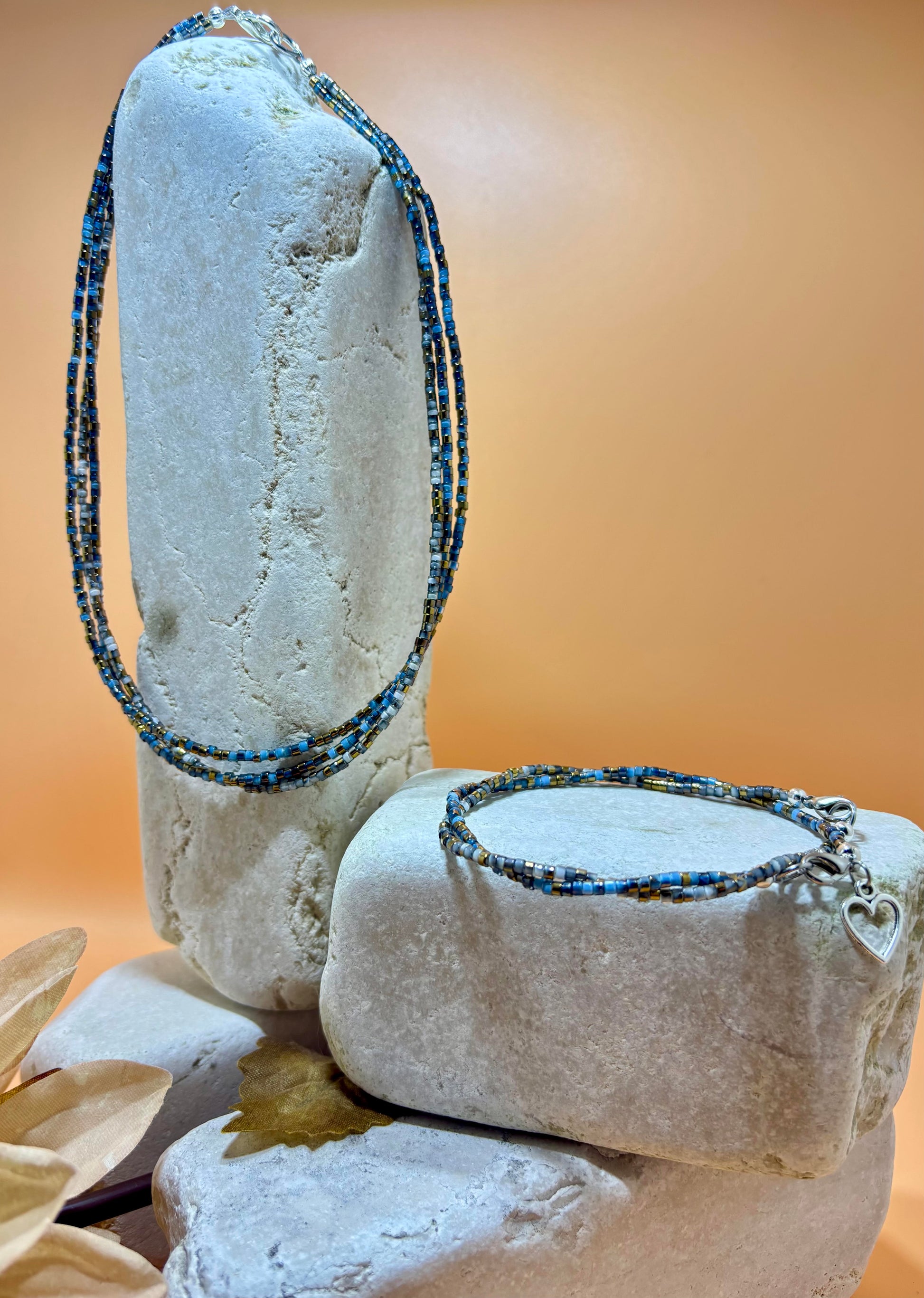 Mooie, fijne en subtiele, set van ketting en armbandjes, gemaakt van hele kleine glaskraaltjes met een blauw/goude gloed. De set bestaat uit een ketting van drie strengen en 2 losse armbandjes, allen afgewerkt met RVS zilverkleurig slotjes. De armbandjes zijn in elkaar verstrengeld en een armbandje heeft een hartje eraan bevestigd zitten. De ketting heeft 2 strengen in iets dieper blauw en 1 streng in wat lichter blauw.