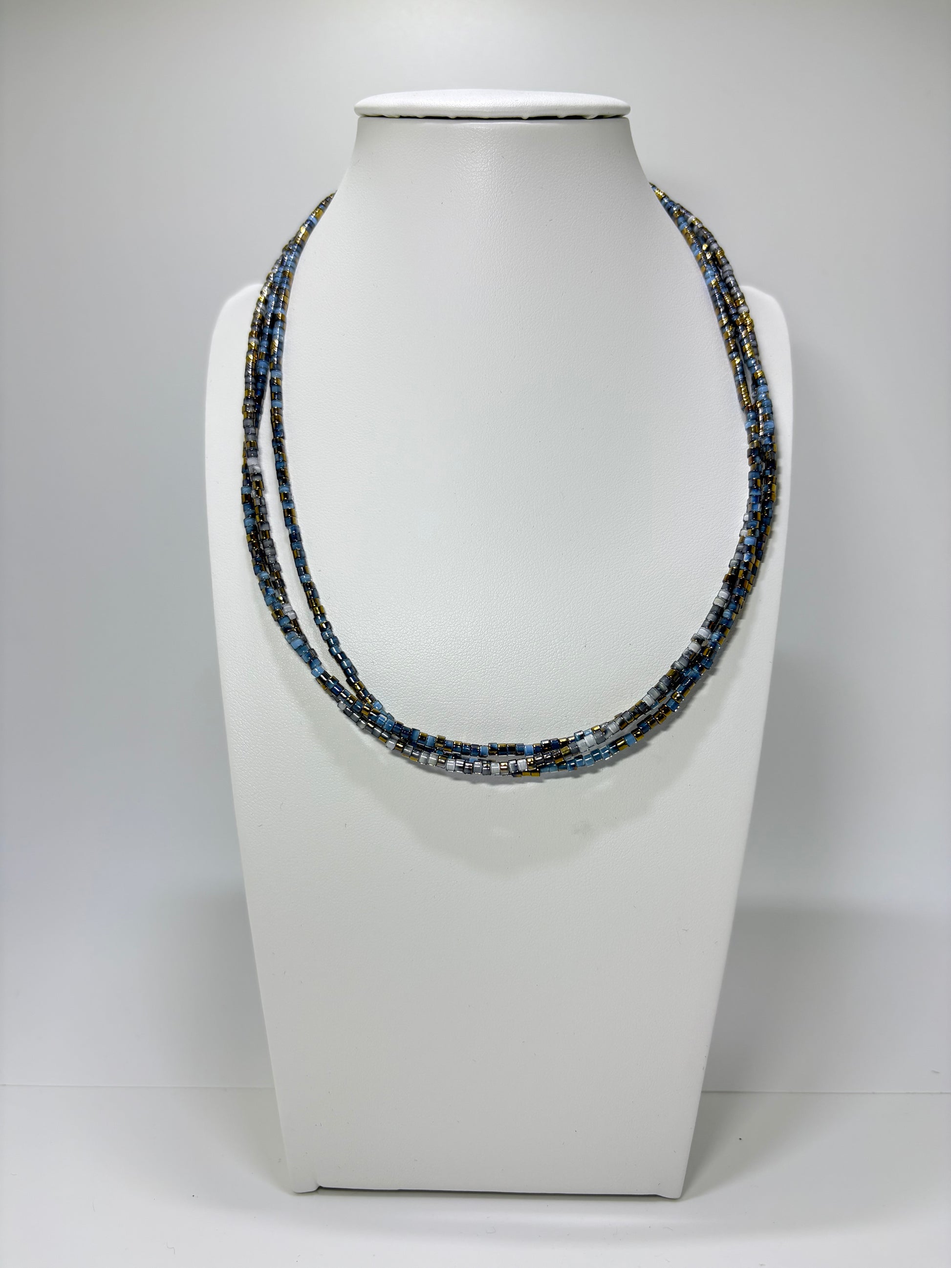 Prachtige halsketting, gemaakt van hele kleine glaskraaltjes met een blauw/goude gloed. De halsketting bestaat uit drie strengen, afgewerkt met een RVS zilverkleurig slotje. De ketting heeft 2 strengen in iets dieper blauw en 1 streng in wat lichter blauw.