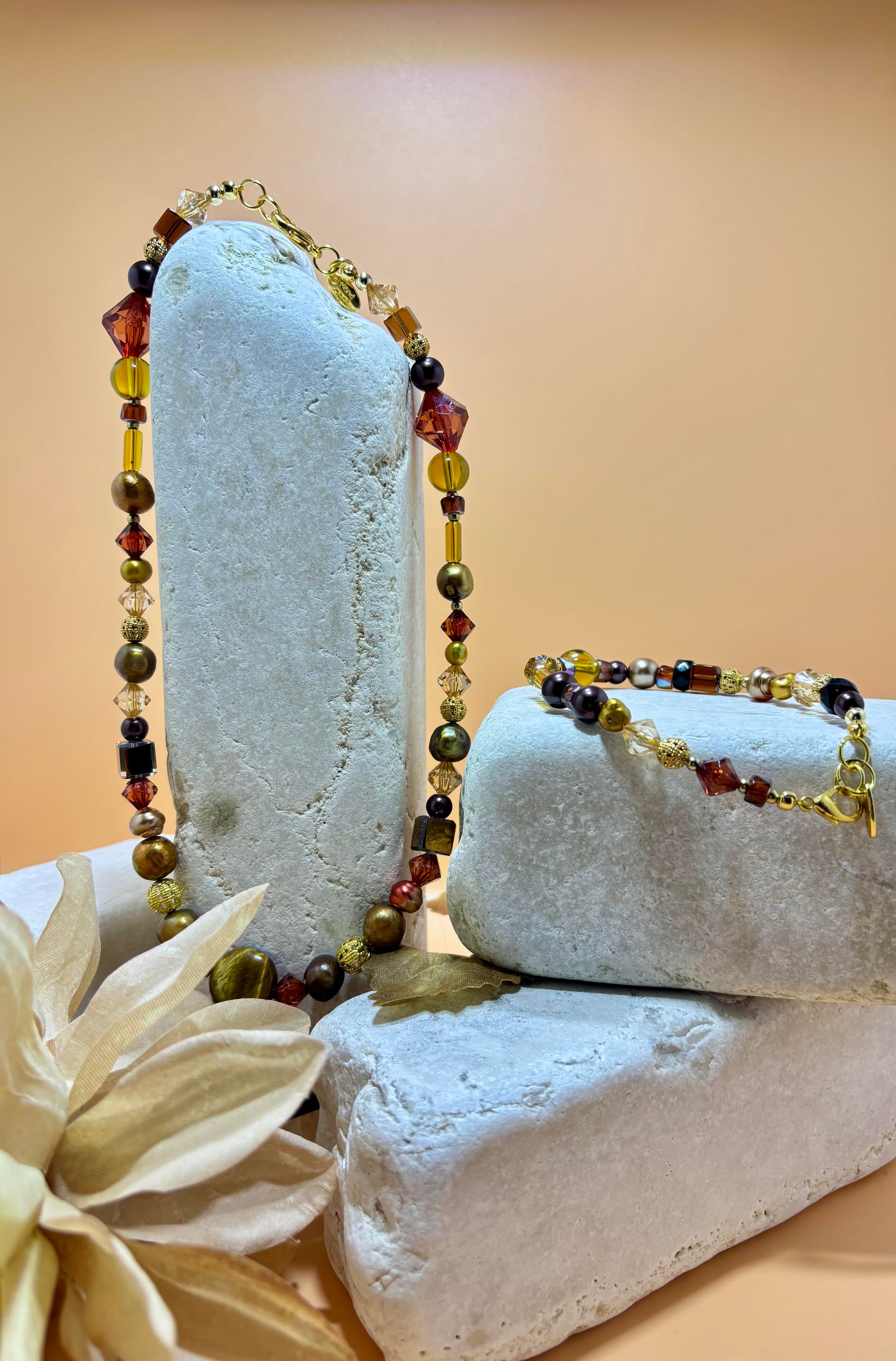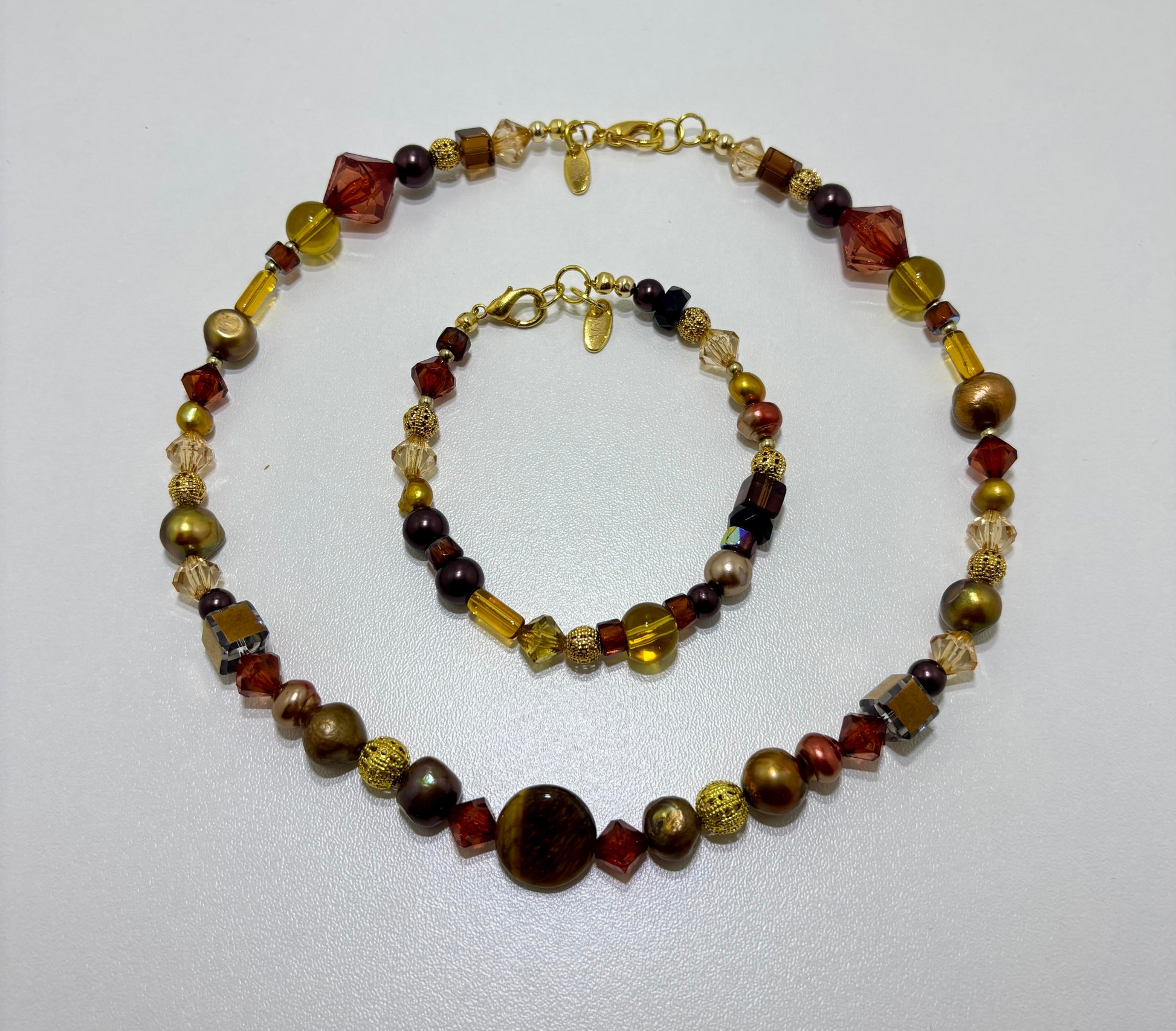 Mooie set van ketting en armband, gemaakt van verschillende soorten, kleuren en maten bruine glaskralen en goudkleurige metalen kralen. Als middelpunt heeft de ketting een bruine tijgeroog kraal. Beiden zijn afgewerkt met een RVS goudkleurig slotje.