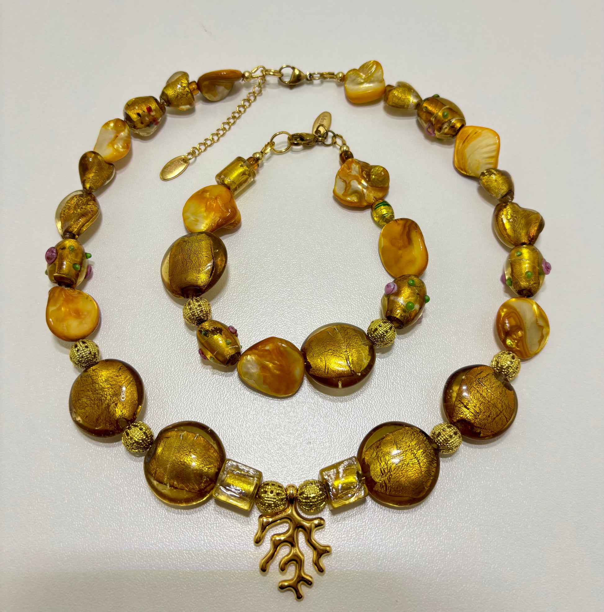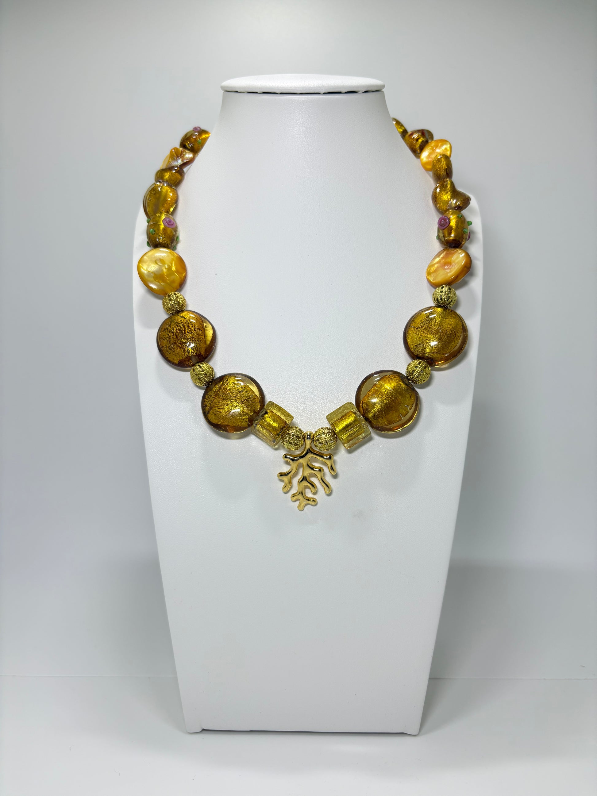 Halsketting van goudkleurige glaskralen, afgewisseld met handgemaakte glaskralen, goudkleurige DQ metaal kralen en kralen gemaakt van schelpen.