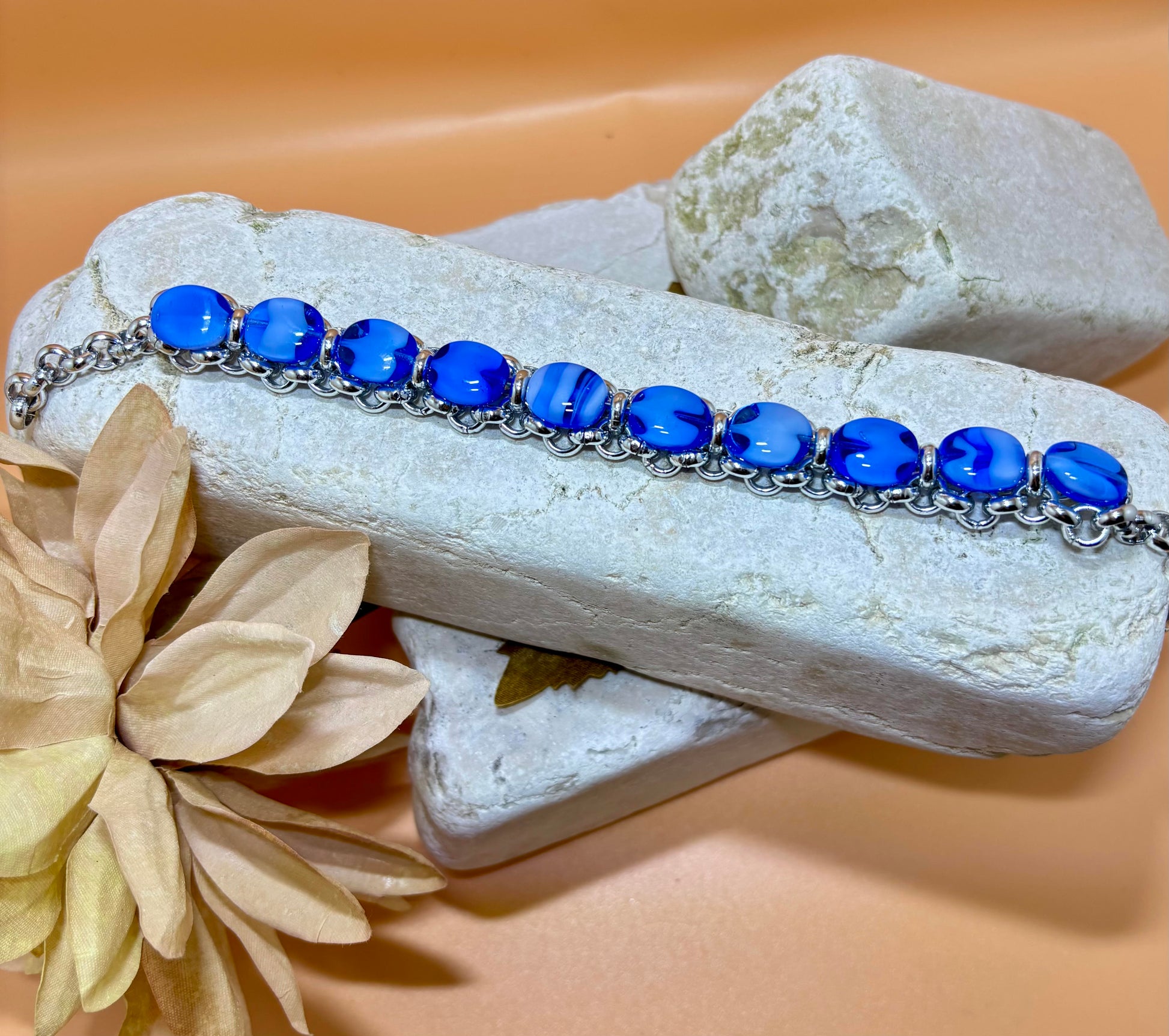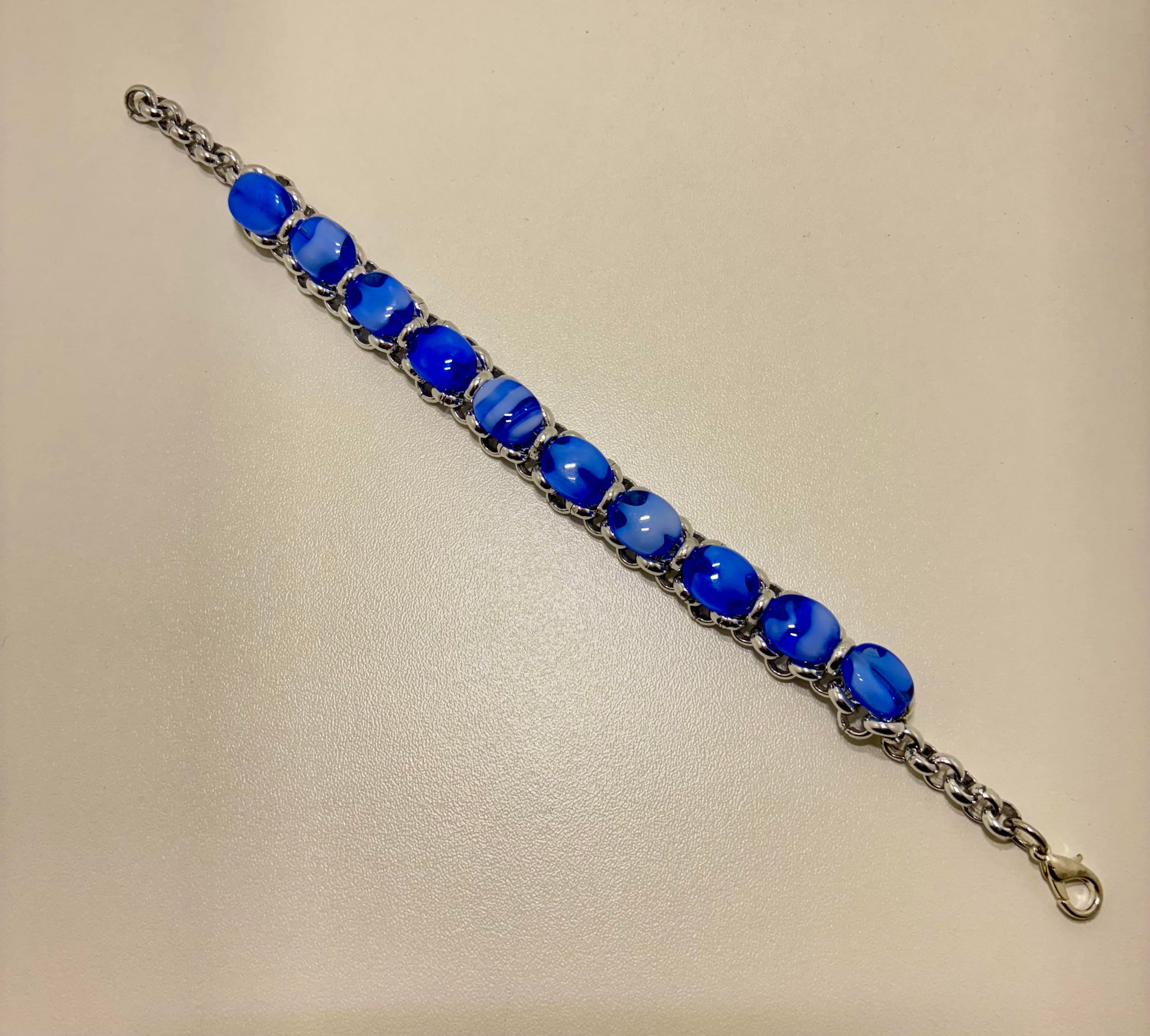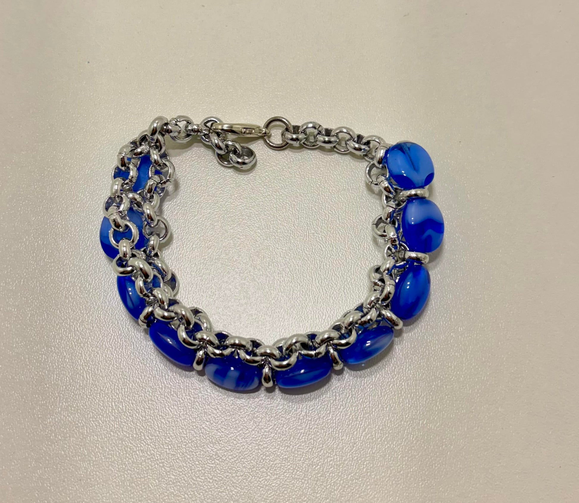 Hele mooie armband, gemaakt van rvs ketting en helblauwe glaskralen.